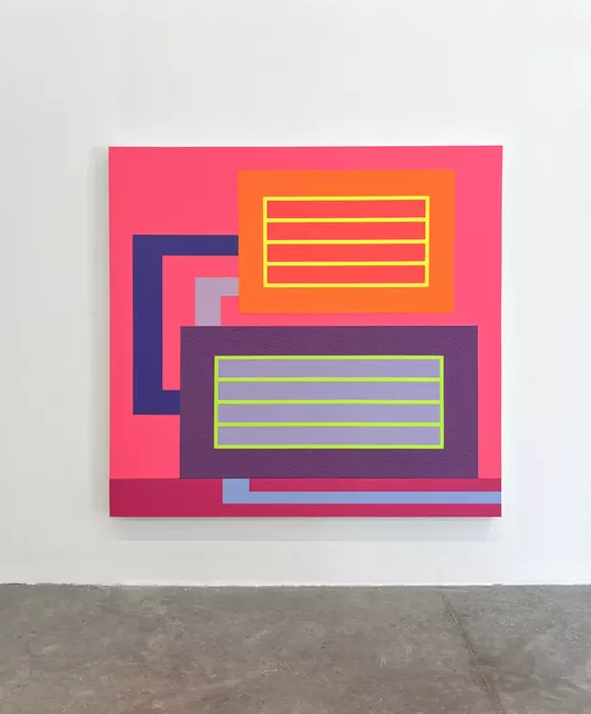 Peter Halley, who emerged in New York’s East Village art scene in the early 1980s alongside Jeff Koons and Julian Schnabel, is best known for his Day-Glo paintings of rectangular cells connected by angular conduits. While he takes inspiration from artists including Piet Mondrian, Josef Albers, and Donald Judd, Halley’s concerns are decidedly contemporary: His abstract diagrams evoke the alienation of prison cells, city living, and technology. Halley consistently works with Roll-a-Tex—an industrial, textured paint used for decoration—and applies his fluorescent hues with a roller instead of a paintbrush; there’s no sign of the artist’s hand in his finished works. Halley’s pieces have sold for up to six-figure prices at auction and can be found in the collections of the Art Institute of Chicago, the Museum of Modern Art, the Tate, and the Centre Pompidou. Halley has also produced works on paper and constructed large-scale installations around the world.