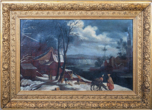 Fine huge 16th Century Flemish/Dutch Old Master winter landscape with figures, oil on canvas. Exceptional large scale and early winter landscape with peasant figures working in the snow clad landscape by the frozen river. Good quality and condition for its age similar to the works of Bruegel.
