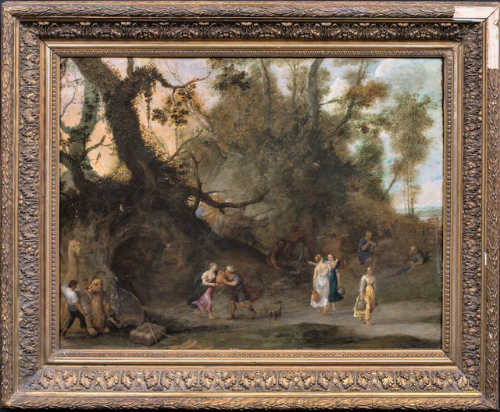 Fine 16th 17th century Flemish Old Master of Rebecca and Eliezer, oil on copper attributed to Andres Snellinck. Superb circa 1600 Flemish woodland scene showing the story of Abraham's servant Eliezer giving Rebecca jewels to seal her betrothal to Isaac, after she had demonstrated the kindness foreseen by Abraham in offering water to Eliezer's camels. Gorgeous figural detail and finishing typical to the best Flemish painting from the period. Good panel condition.
