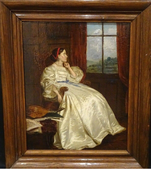 Fine 19th Century English School portrait of a lady in reflective mood, oil on canvas. Good quality and condition full length study of the young lady wearing a fine white dress looking towards the window deep in thought. Wooden frame, no visible signature but certainly by an accomplished English portrait or genre painter.