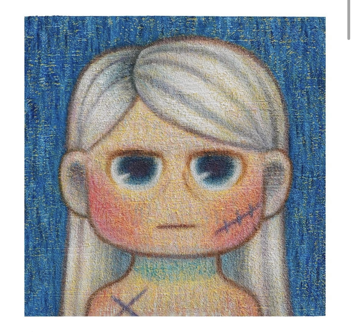 The work, with a single painting as its main medium, is famous for its quirky, innocent girl in a never-ending conflict. It's a little girl with a scar on her face, staring back at you like the name of the work.