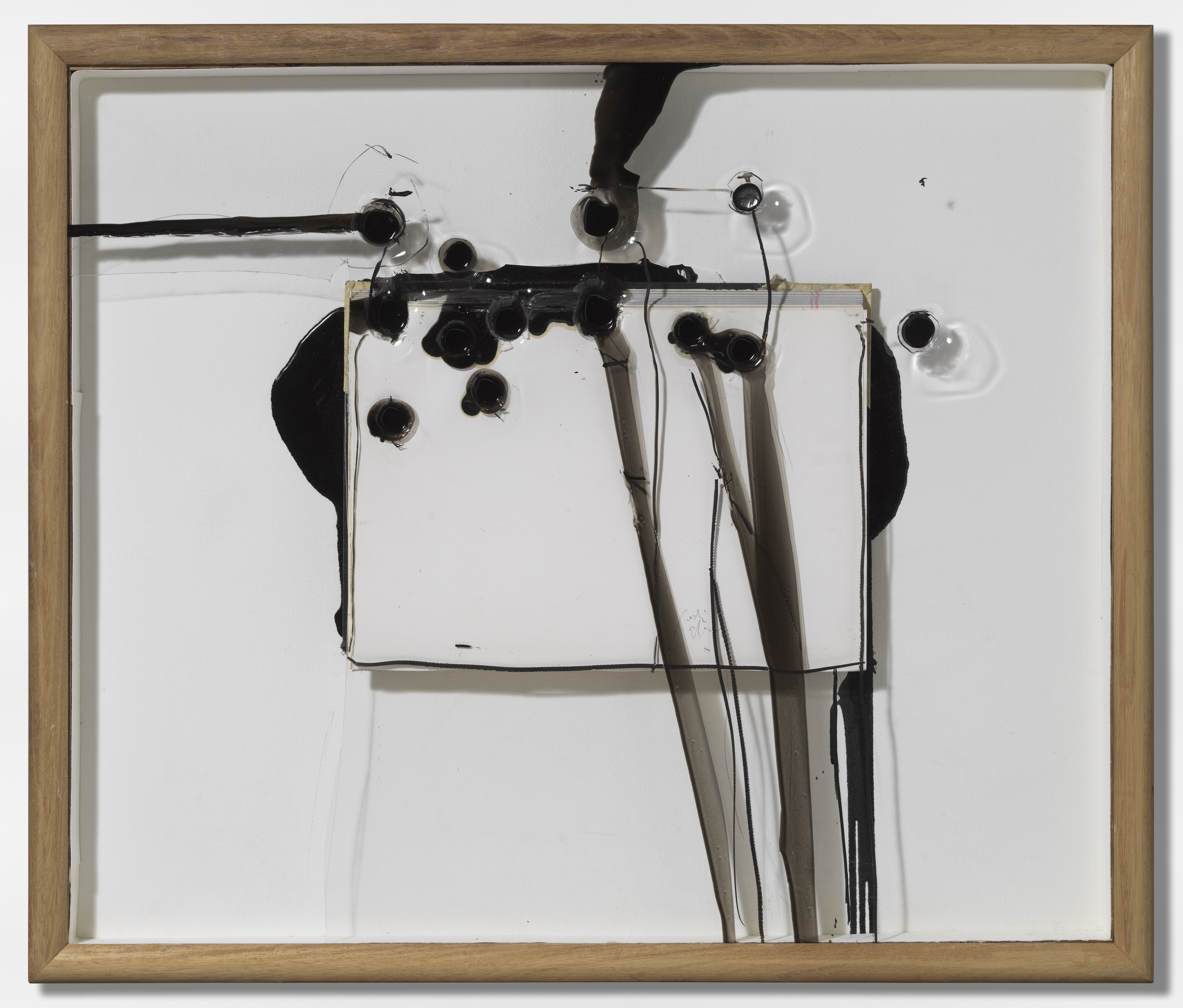Alcaraz incorporates a great number of different materials to his minimalistic works including metal, wood, paper, books, ceramics, as well as transparent objects, like plexiglass (which he sometimes modifies by bending or melting holes in it). Traditional painting mediums and colors are not used to a great extent - instead the artist utilizes the interplay between shadow and light with different materials and surfaces. The distinct black lines of ink and metal wire create circular and angular forms in the midst of three-dimensional layers.