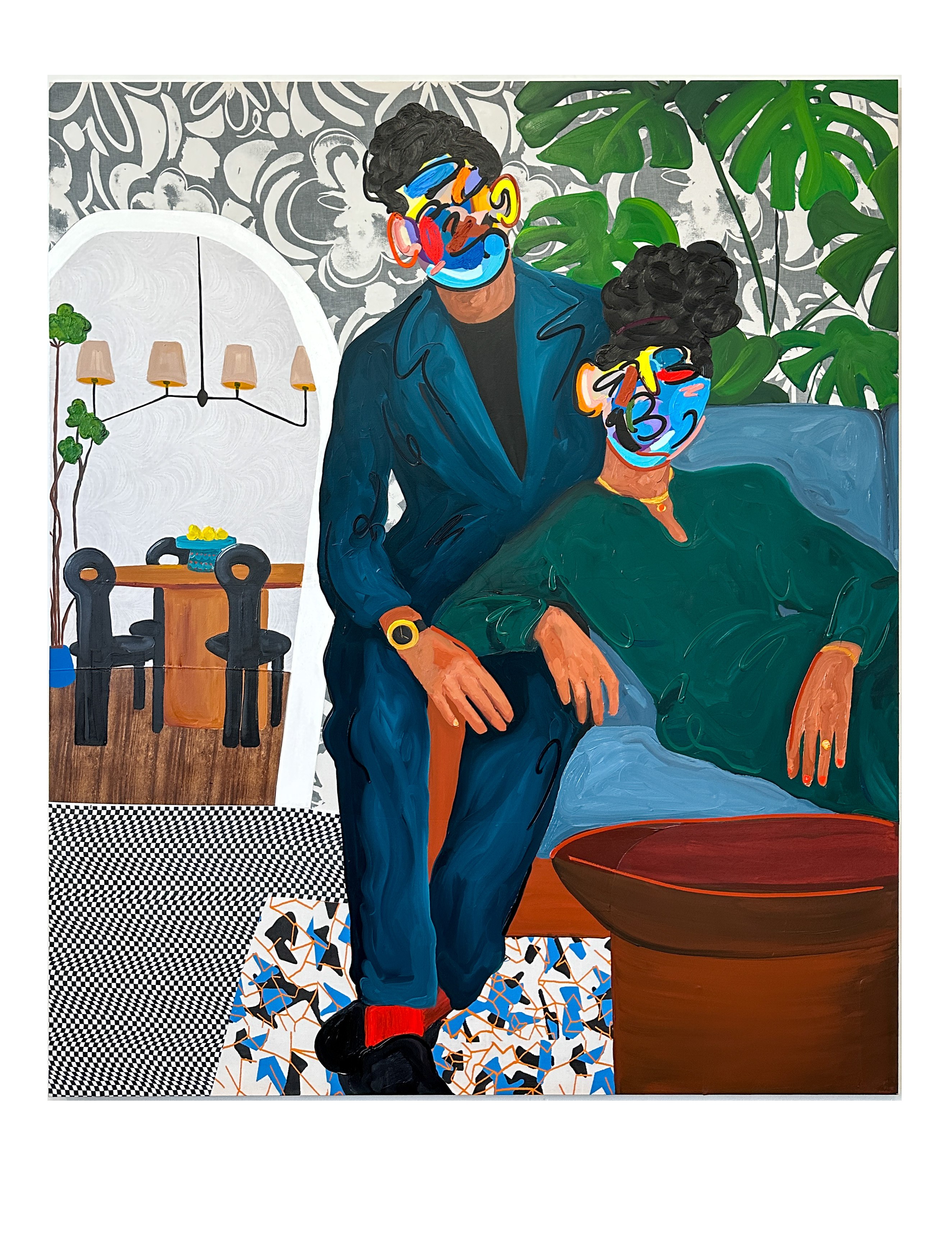 Despite changing the style of painting from abstract to figurative, the newer works share some traits with the earlier works, like the inventive use of fabric. In the previous works fabric played mostly a role in creating form, but in the new works, fabric is used as a tool to represent different objects and materials, such as window frames or floor tiling. Another point of contact to his previous paintings is the use of gestural movements - the painter’s “sweet spot” as he describes them – in the faces of the characters.