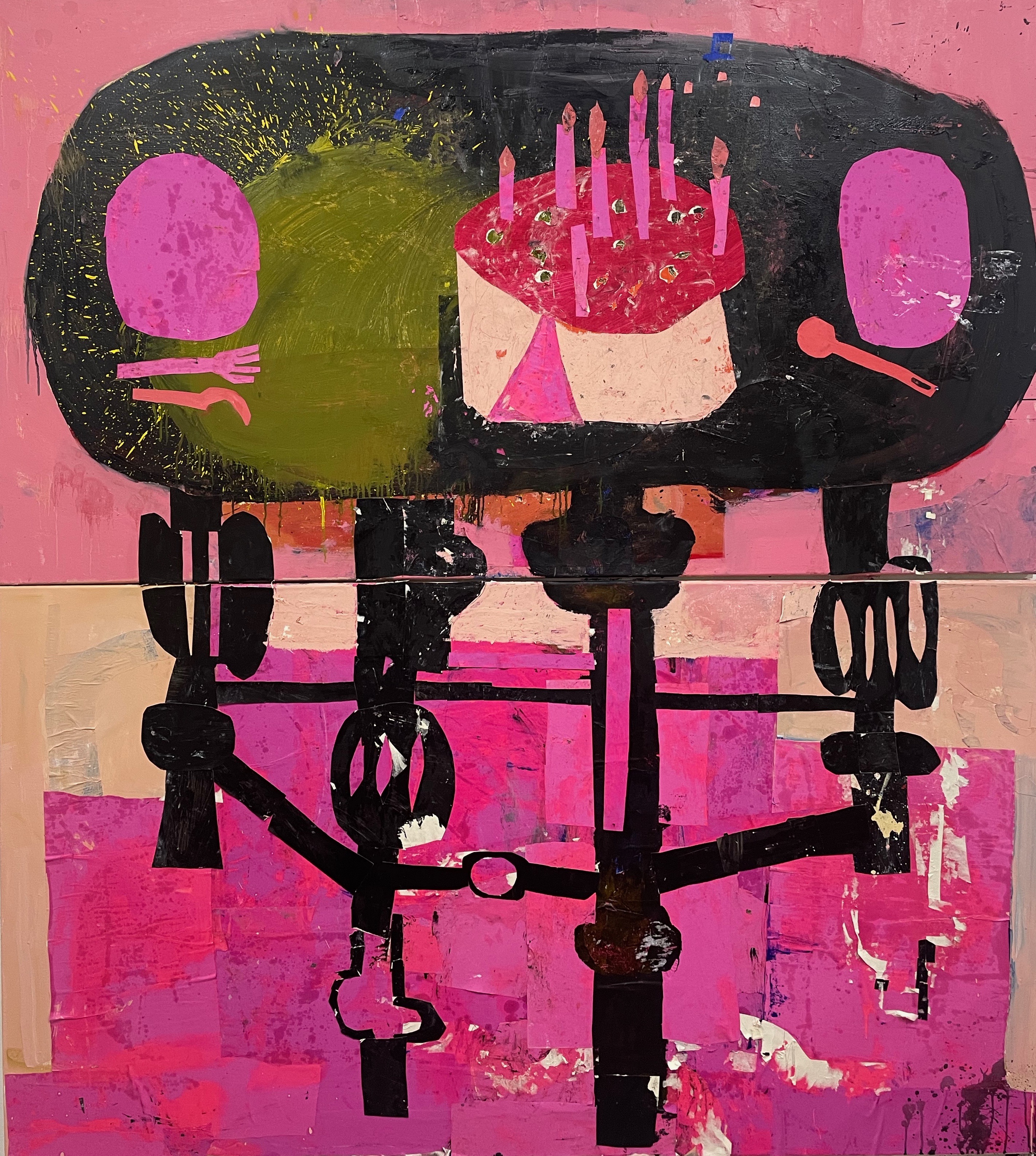 Hutchings explains the two-part painting “Birthday Cake” (2021-2022): “When making this piece I really liked playing around with the idea of the birthday cake alone on the table, the candles still lit, the plates ready for a slice. The more I looked at the painting though, I felt the birthday cake is not alone - for me the plates, the forks and even the table legs seemed to be people. I personally feel they have just as much character as if I had depicted an actual person. Collage was so important in making this, the pink paper was found in a second hand shop, it had so much character as there were so many shades to it, from a neon pink to a dusky pink, and this really made the process more exciting.”