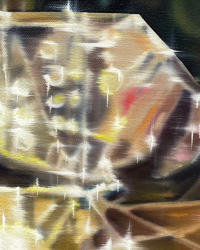 王金博作品的画面经常布满了闪烁的星光,这也是他个人独特的艺术语言,以抒发自身以及他那一代人所面临的不安和缺乏安全感的内在情感。作品承载了他对这个时代的观察和反思,那些梦幻的场景就如同现实生活虚幻的一面,当中掺杂了现代人茫然的心灵,尽管生活在群体当中,个体其实经历着孤寂的情感。 除了探索自我,创作的过程对王金博而言如同自我和解。疫情无疑为他营造了莫大的沉思空间以及自我探索的机会,他希望能够藉由创作也令观众沉淀自我,实现自我和解。当王金博觉察到自己的内在不安以及社交恐惧之后,他只是以淡然的态度面对,并且自我沉浸在他所建立的世界当中。由此,王金博把这种舒适感和求稳的思维延展到创作里面,专注地在将其内在情绪投射到作品的人物和景象之中。 除此之外,创作也是他面对社交问题时的一种响应方式。在某些社交场合之下,他以侃侃而谈的一面来修饰掩盖掉真实的自我、内心的纠结和抗拒的心态,如此表现对他而言委实背迹违心。这种个体的孤独以及疏离感在作品里透过旁观者的角度深刻的体现出来,并且打造了一个空间让人思考应该如何面对孤单、焦虑以及人际交往的问题。 诚然绘画是一个让王金博思考和消化讯息的过程。比起制定好计划,他专注于当下,自然而然的进行着他的创作。他的作品强调了色彩,而且细腻的刻画了人物的轮廓。那些闪闪发光的质感至今一直贯穿在他的创作历史当中,从以前描绘的点点星光到如今璀璨的闪光,彷佛在不断扩展着一个超凡脱俗的宇宙景象,而他在当中寻找到属于自己的自在之地。