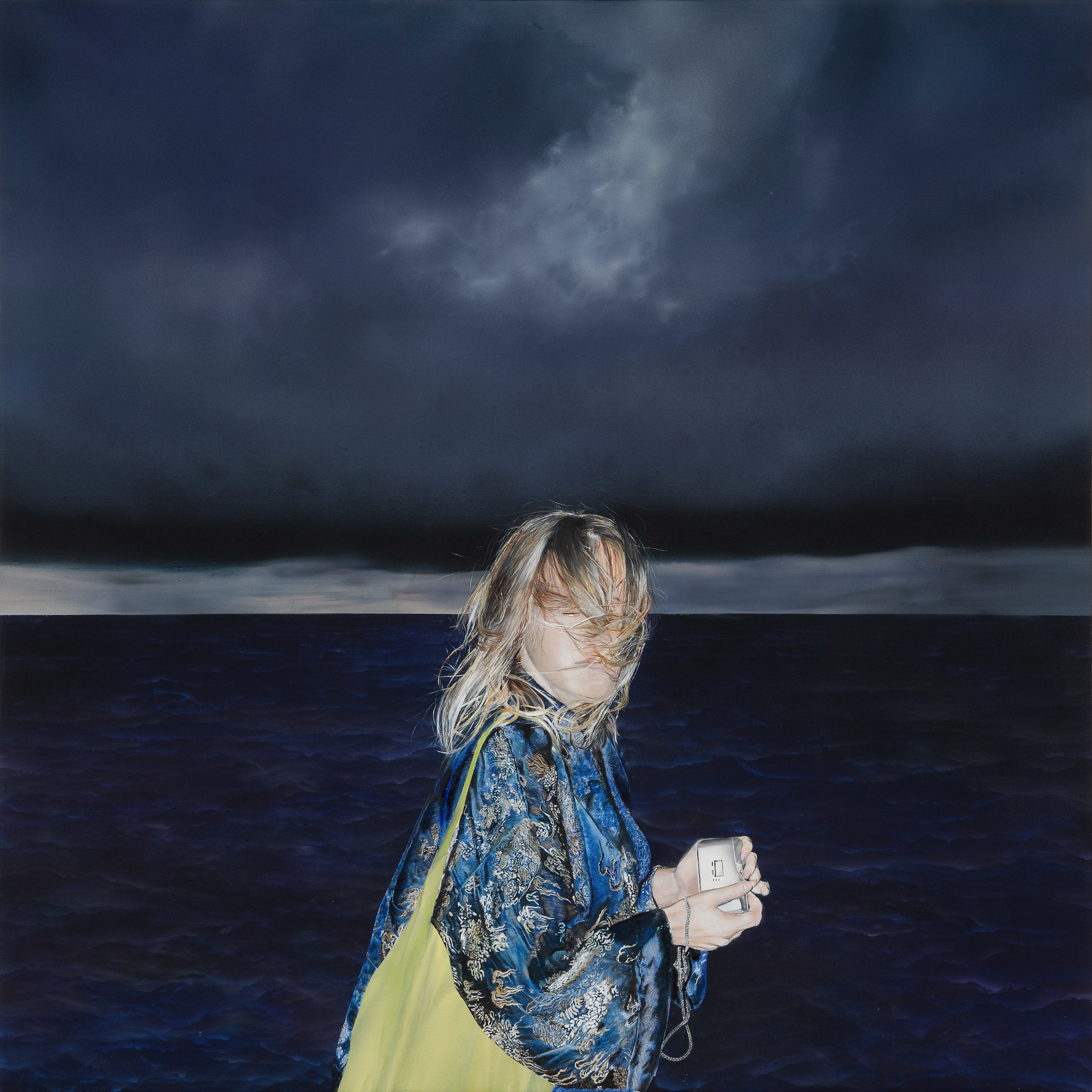 The paintings in the exhibition centre on the theme of escapism. The gaze of some of the figures eludes the viewer and the situations in the pictures are set amid a variety of escapist activities, such as celebrations, travel and contemplation. The most visible features of several of the paintings have taken their inspiration from the world of electronic music and the places where it is performed. Typically, these places range from high, spacious warehouses to cramped concrete cellars, with those present hidden by the dense mist from smoke machines and by geometric patterns from projectors. Rave culture has conventionally been documented with a focus on its political and hedonistic aspects, but Itälinna is interested in the momentary, suspended nature of their settings. Besides a sense of belonging and empowerment, these places cut off from everyday life and the outside world, offer many people a chance to go deep into a meditative state and reflection.