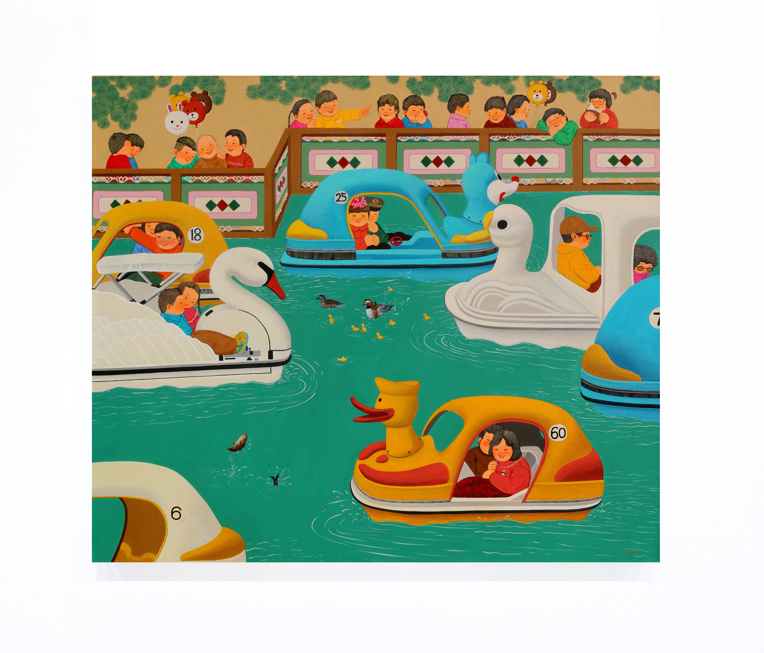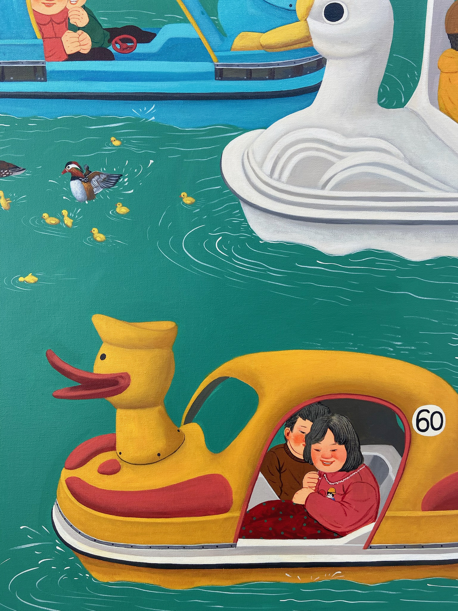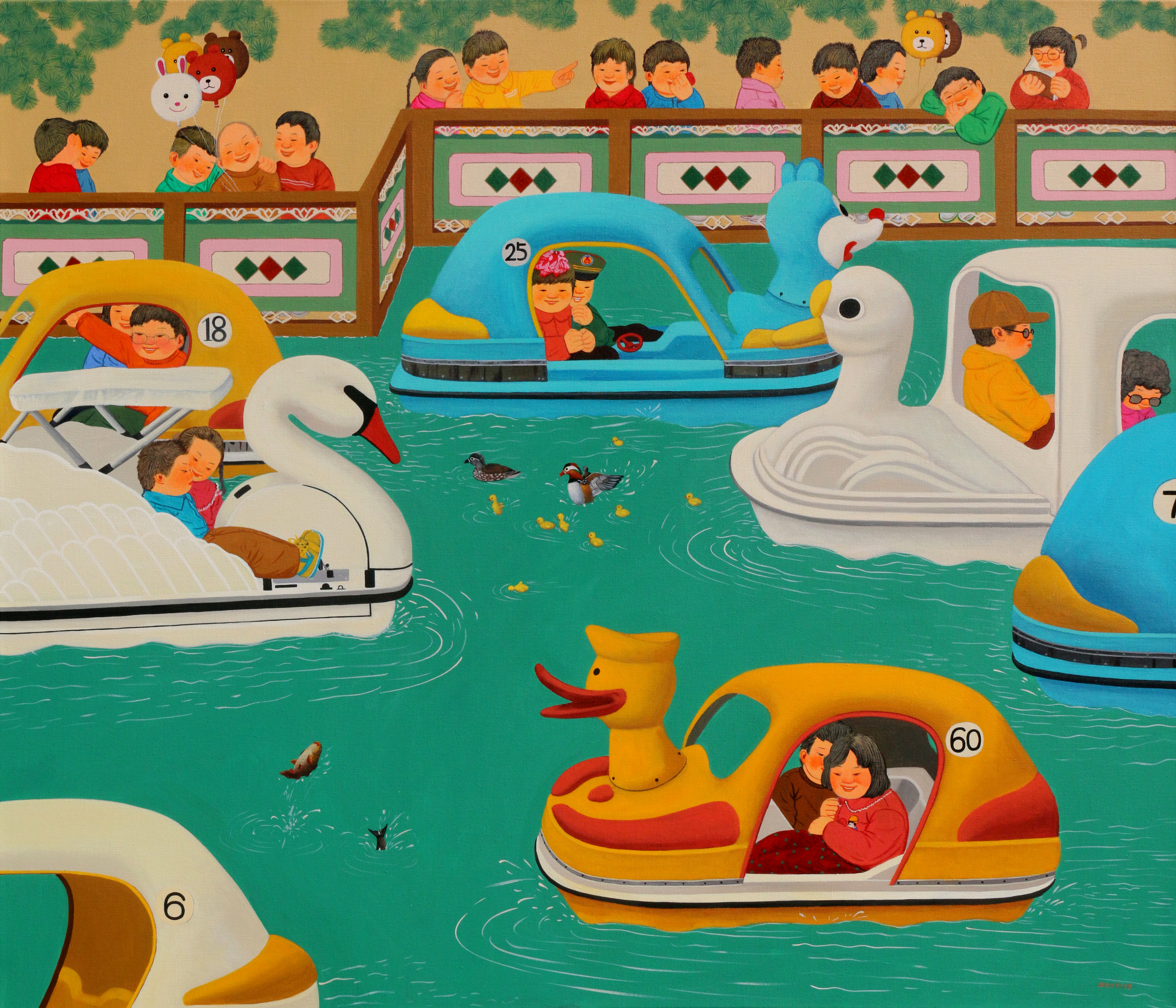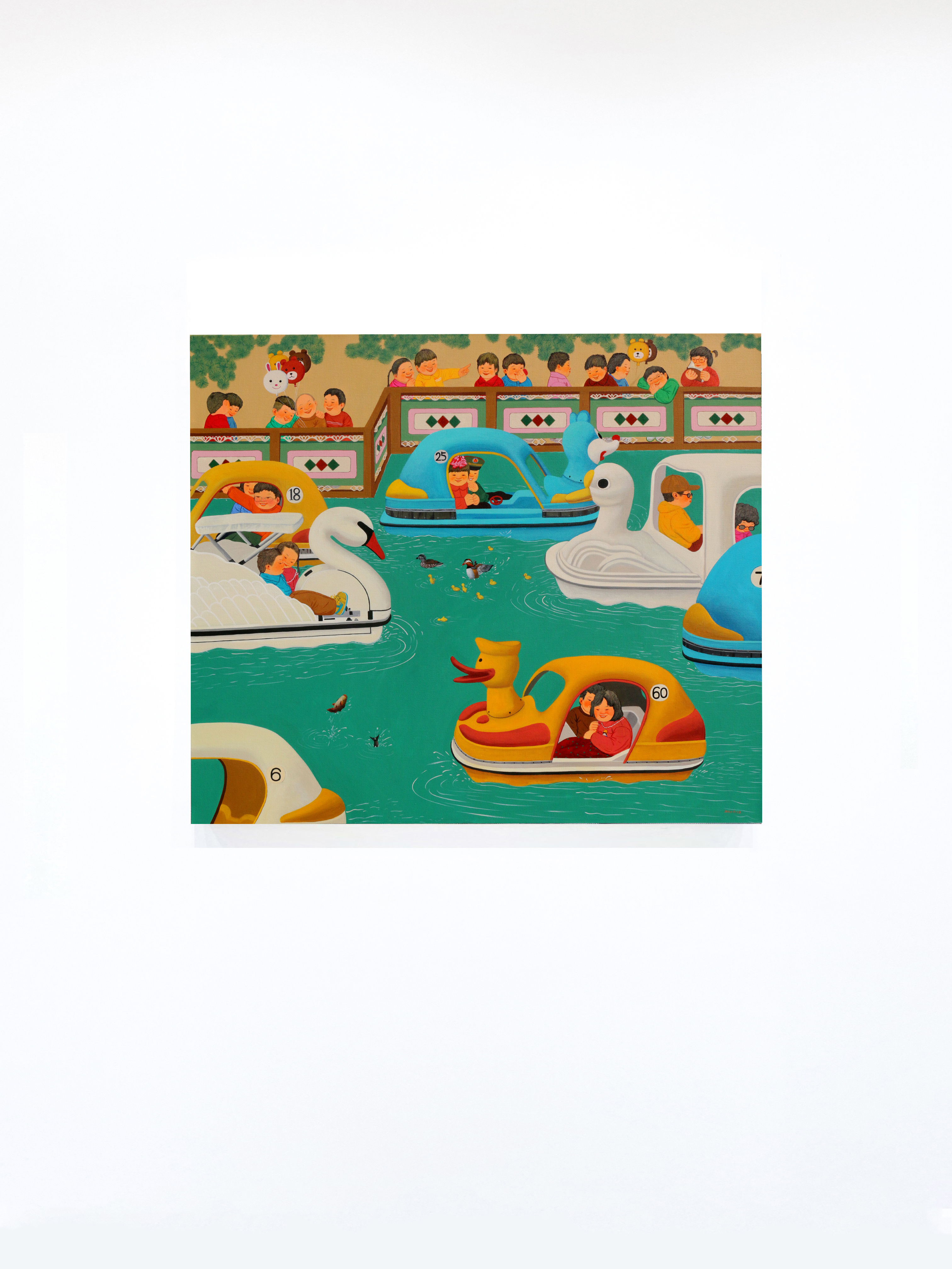 张庆祝的作品大多数展现了怀旧之情,着重于改革开放之后1980年至90年之间中国社会快速转变的回忆。尽管目睹了大时代的变迁,他仍以明亮饱满的绘画语言来展现民间的纯朴和平民百姓在大气候下的顽强适应力。 张庆祝的作品承载了一个时代的共同回忆,他选择利用一种正面的述说方式来展现人民的生活状态。尽管在过去数十年经历了社会变迁,在张的艺术实践中他还是经常运用小孩的形象,体现他在时代洪流之中所秉持的乐观心态。他以一种戏剧化的方式来展现民间景观,笔下经常出现表情动作丰富的小孩和动物,令内容增添几分趣味和活力,人物身后那些显而易见的标语更加强了这种舞台效果。同时,艺术家别具心裁地描绘光影和平面的几何图案,如此这些受着约束的线条与小孩的天真自然并置,形成一丝错落感,也如同暗示着一些美好事物将随着时间瓦解一般。这样的空间布置就像在邀请观者进入到一场过去与今日的对话和交流之中。 张庆祝透过双眼敏锐地捕捉下民间的生活百态,同时借着照相机来拍下身边的街道场景,并透过绘画的方式来响应现实的世界。然而,他笔下的景观又刻意与现实保持着一些距离,体现出一种稍纵即逝又真切的情感。他把作品切割成不同部分,在建立空间感的同时又保持着整体画面平坦的风格,加上饱满且细致的色彩和细节,可见其对超现实画法的掌控力。三维的背景为整体叙事铺垫了具有现实感的基调,再加上那些脱离现实的缤纷色彩,这种张力更突显了如梦似的过往。 艺术家以油画作为媒介来追忆他的童年记忆,超现实的构图令人联想起比利时画家保罗·佛朗哥(Paul Franco Delva-ux)和萨尔瓦多·达利(Salvador Dali)梦幻的叙事方式。而且,在中国艺术家丰子恺和齐白石的启发之下,张庆祝也运用卡通风格和俏皮的主题来进行创作。他的视觉语言源自于他对童年往事的好奇心和想象,并以此转化成跨越时间和空间的意涵,在他自身和观众之间搭建起一道对话的桥梁。张庆祝的每一幅作品都只是宏大叙事里的碎片,然而社会改革的辛劳则在他作品当中悄然的被掩饰过去。 小孩子经常对周遭世界抱住天真和好奇,此形象让张庆祝能够在作品当中强调人纯朴和自然的一面。艺术家把现实世界与幻想结合,从自身见证时代变迁的经历到回顾过往,试图呈现人民在快速改变的时代洪流之中,仍然能够圆满自足。