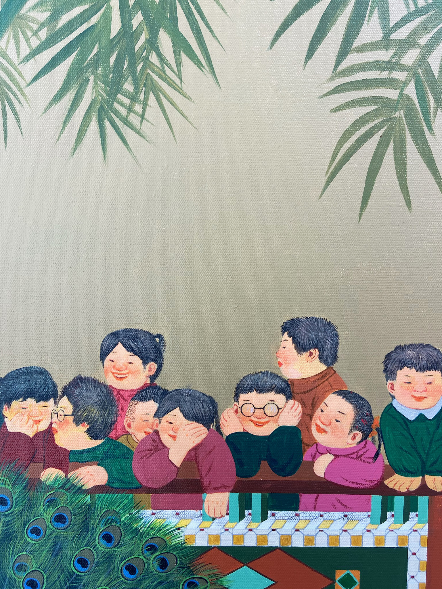 张庆祝的作品大多数展现了怀旧之情,着重于改革开放之后1980年至90年之间中国社会快速转变的回忆。尽管目睹了大时代的变迁,他仍以明亮饱满的绘画语言来展现民间的纯朴和平民百姓在大气候下的顽强适应力。 张庆祝的作品承载了一个时代的共同回忆,他选择利用一种正面的述说方式来展现人民的生活状态。尽管在过去数十年经历了社会变迁,在张的艺术实践中他还是经常运用小孩的形象,体现他在时代洪流之中所秉持的乐观心态。他以一种戏剧化的方式来展现民间景观,笔下经常出现表情动作丰富的小孩和动物,令内容增添几分趣味和活力,人物身后那些显而易见的标语更加强了这种舞台效果。同时,艺术家别具心裁地描绘光影和平面的几何图案,如此这些受着约束的线条与小孩的天真自然并置,形成一丝错落感,也如同暗示着一些美好事物将随着时间瓦解一般。这样的空间布置就像在邀请观者进入到一场过去与今日的对话和交流之中。 张庆祝透过双眼敏锐地捕捉下民间的生活百态,同时借着照相机来拍下身边的街道场景,并透过绘画的方式来响应现实的世界。然而,他笔下的景观又刻意与现实保持着一些距离,体现出一种稍纵即逝又真切的情感。他把作品切割成不同部分,在建立空间感的同时又保持着整体画面平坦的风格,加上饱满且细致的色彩和细节,可见其对超现实画法的掌控力。三维的背景为整体叙事铺垫了具有现实感的基调,再加上那些脱离现实的缤纷色彩,这种张力更突显了如梦似的过往。 艺术家以油画作为媒介来追忆他的童年记忆,超现实的构图令人联想起比利时画家保罗·佛朗哥(Paul Franco Delva-ux)和萨尔瓦多·达利(Salvador Dali)梦幻的叙事方式。而且,在中国艺术家丰子恺和齐白石的启发之下,张庆祝也运用卡通风格和俏皮的主题来进行创作。他的视觉语言源自于他对童年往事的好奇心和想象,并以此转化成跨越时间和空间的意涵,在他自身和观众之间搭建起一道对话的桥梁。张庆祝的每一幅作品都只是宏大叙事里的碎片,然而社会改革的辛劳则在他作品当中悄然的被掩饰过去。 小孩子经常对周遭世界抱住天真和好奇,此形象让张庆祝能够在作品当中强调人纯朴和自然的一面。艺术家把现实世界与幻想结合,从自身见证时代变迁的经历到回顾过往,试图呈现人民在快速改变的时代洪流之中,仍然能够圆满自足。