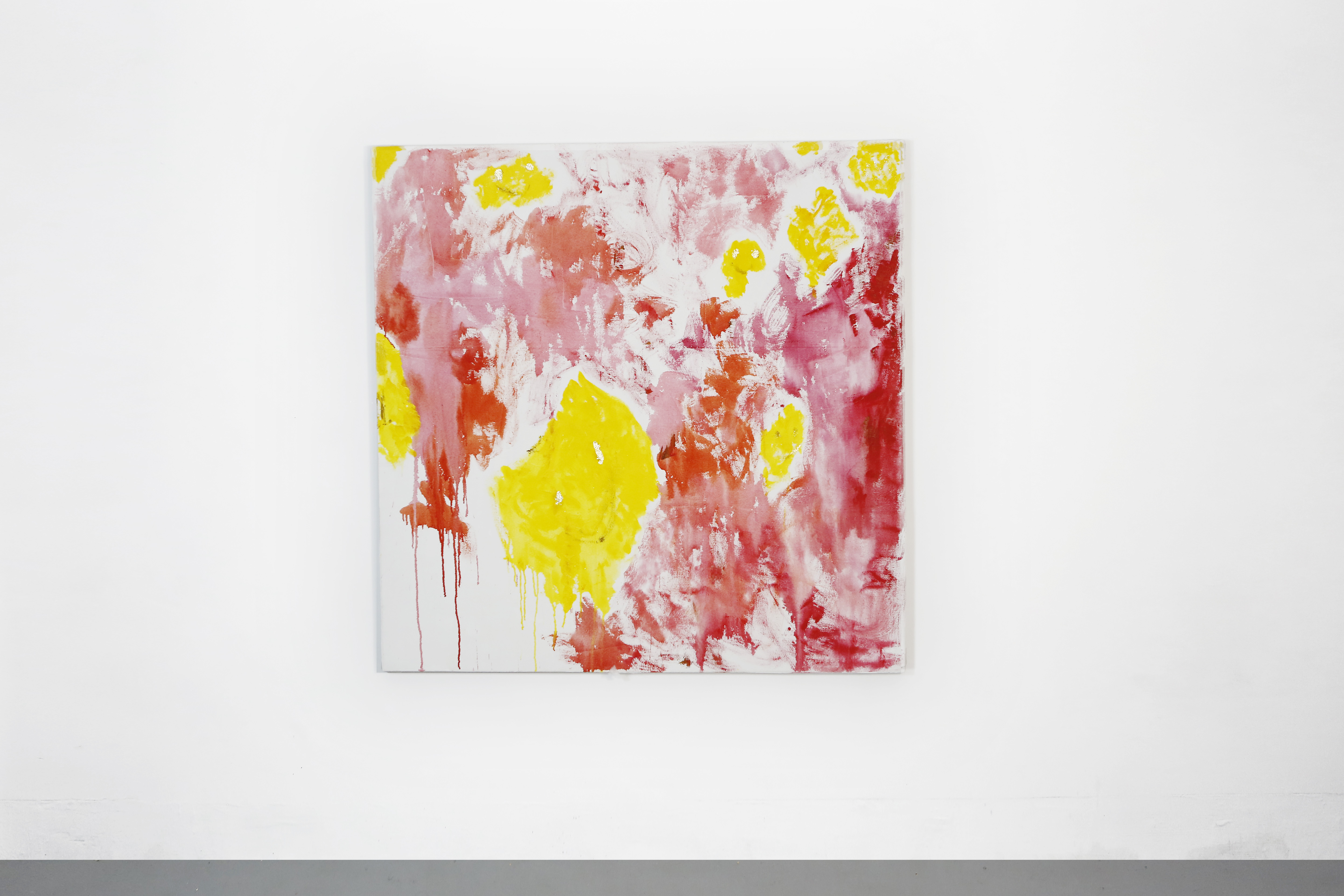 艺术家延用过往作品中惯用的emoji笑脸符号,发展成为“幽灵”般流动的色块,使其更加肆意和奔放,具有书写意味。正如卡夫卡所指,书信是与幽灵的交流,写在纸上的亲吻不会到达它的目的地,它会在半路上被幽灵捕获。艺术家使用金属粉和植物粉末自制颜料,并注入金箔,藉此描绘着阳光、热带作物以及石榴等物像,它们是热量、普照与孕育的反哺关系。在每幅画面中,同时蕴含了艺术家对亲人“隐藏式信件”的表述。在画面中传递能量,传递劳作,而数字化时代的幽灵也成为了无处不在的“信使“。