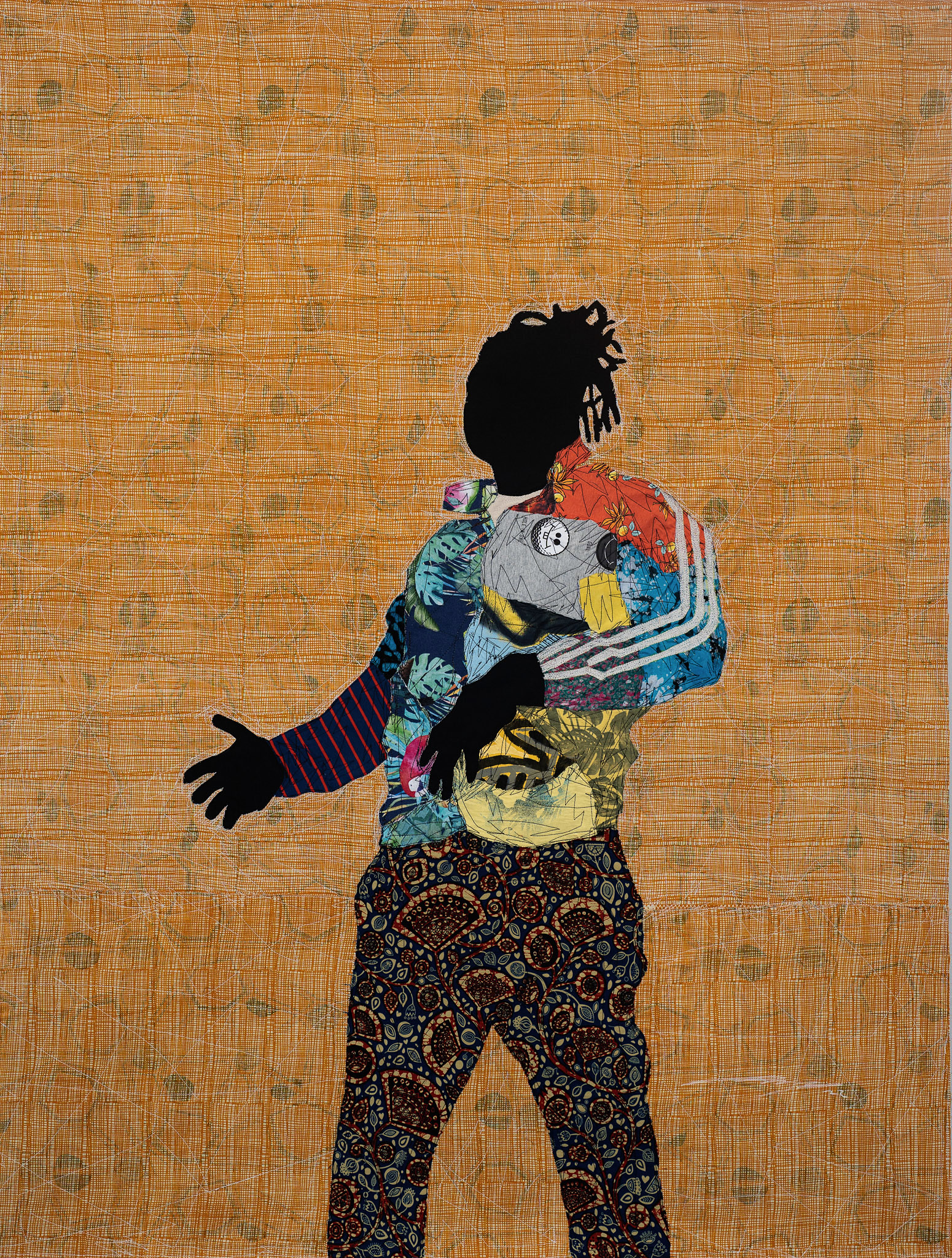 Raphael Adjetey Adjei Mayne collects unique fabrics that contain intricately woven patterns and sews them onto his mixed-media works. Mayne then paints detailed colorful elements on top of the sewn fabrics with acrylic paint to create the multi-layered works. The picture themes range from floral patterns to depictions of young adults and children posing nonchalantly wearing bold, colorful designs, often juxtaposed with bright monochrome backgrounds. The themes of his works are a mix of Mayne’s childhood memories and current social topics.