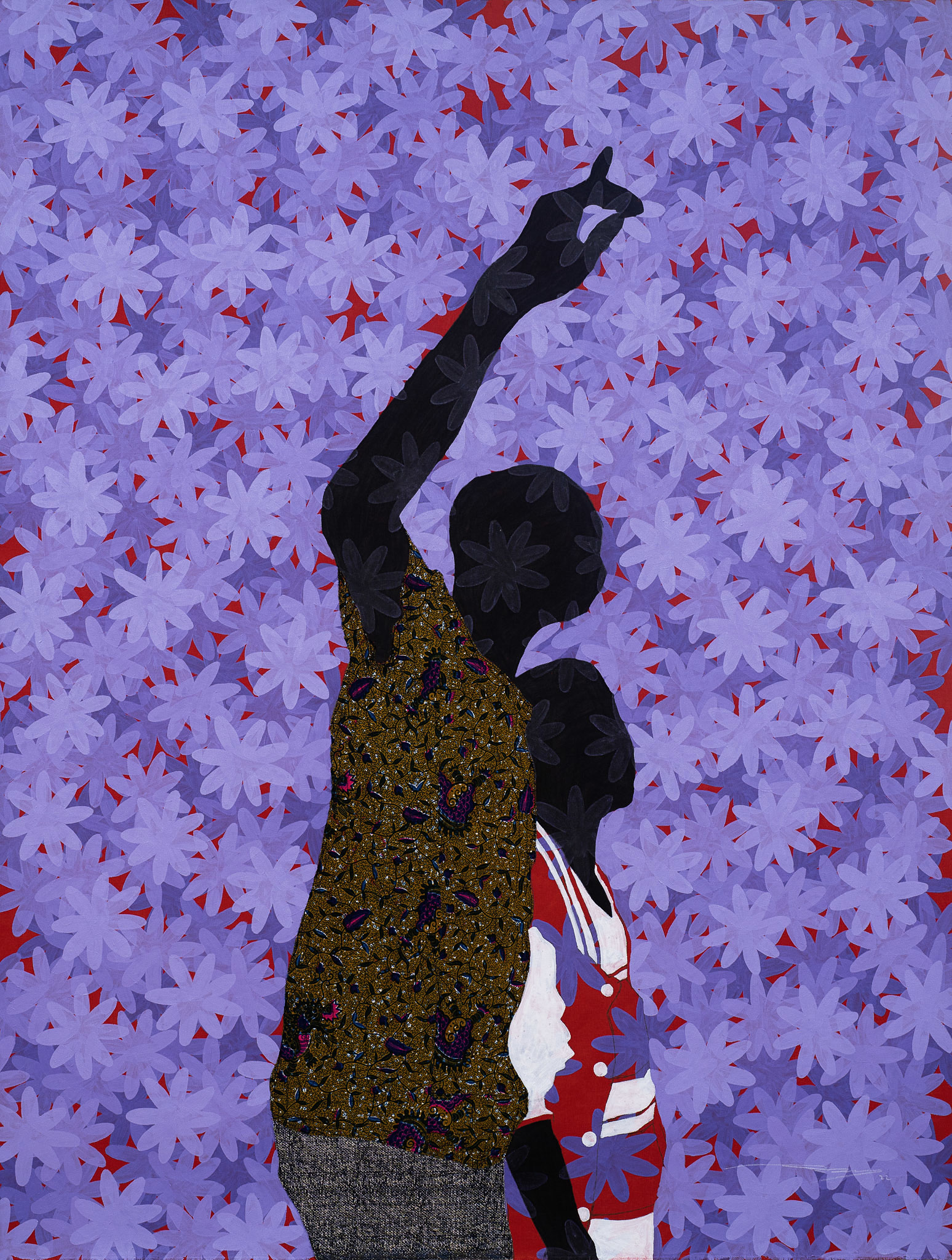 Raphael Adjetey Adjei Mayne collects unique fabrics that contain intricately woven patterns and sews them onto his mixed-media works. Mayne then paints detailed colorful elements on top of the sewn fabrics with acrylic paint to create the multi-layered works. The picture themes range from floral patterns to depictions of young adults and children posing nonchalantly wearing bold, colorful designs, often juxtaposed with bright monochrome backgrounds. The themes of his works are a mix of Mayne’s childhood memories and current social topics.