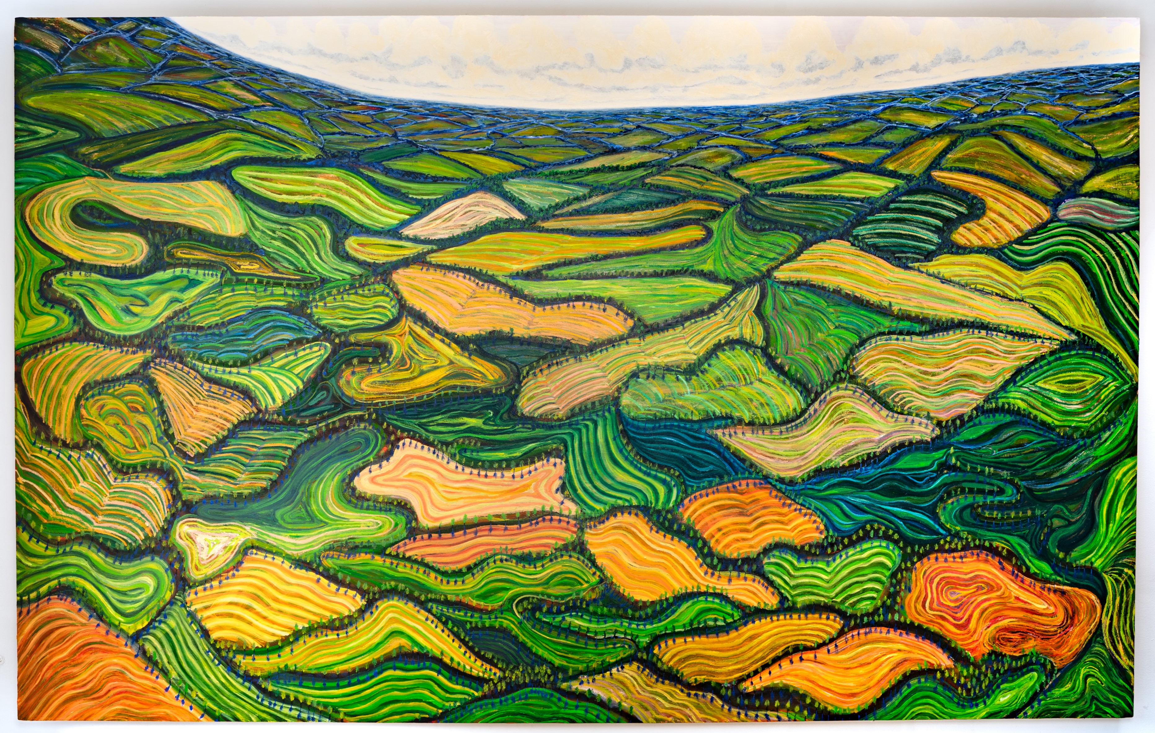 Through making landscape paintings, Grieve finds himself engaging in reveries and nostalgia from remembered landscapes and experiences. They reference actual places merging poetic rural ideals, sometimes underpinned with fragments and marks from urban angles and the sound of the city. In bringing together these elements, Grieve celebrates the unique qualities of painting, constructing illusory spaces through mark-making and strokes of colour.