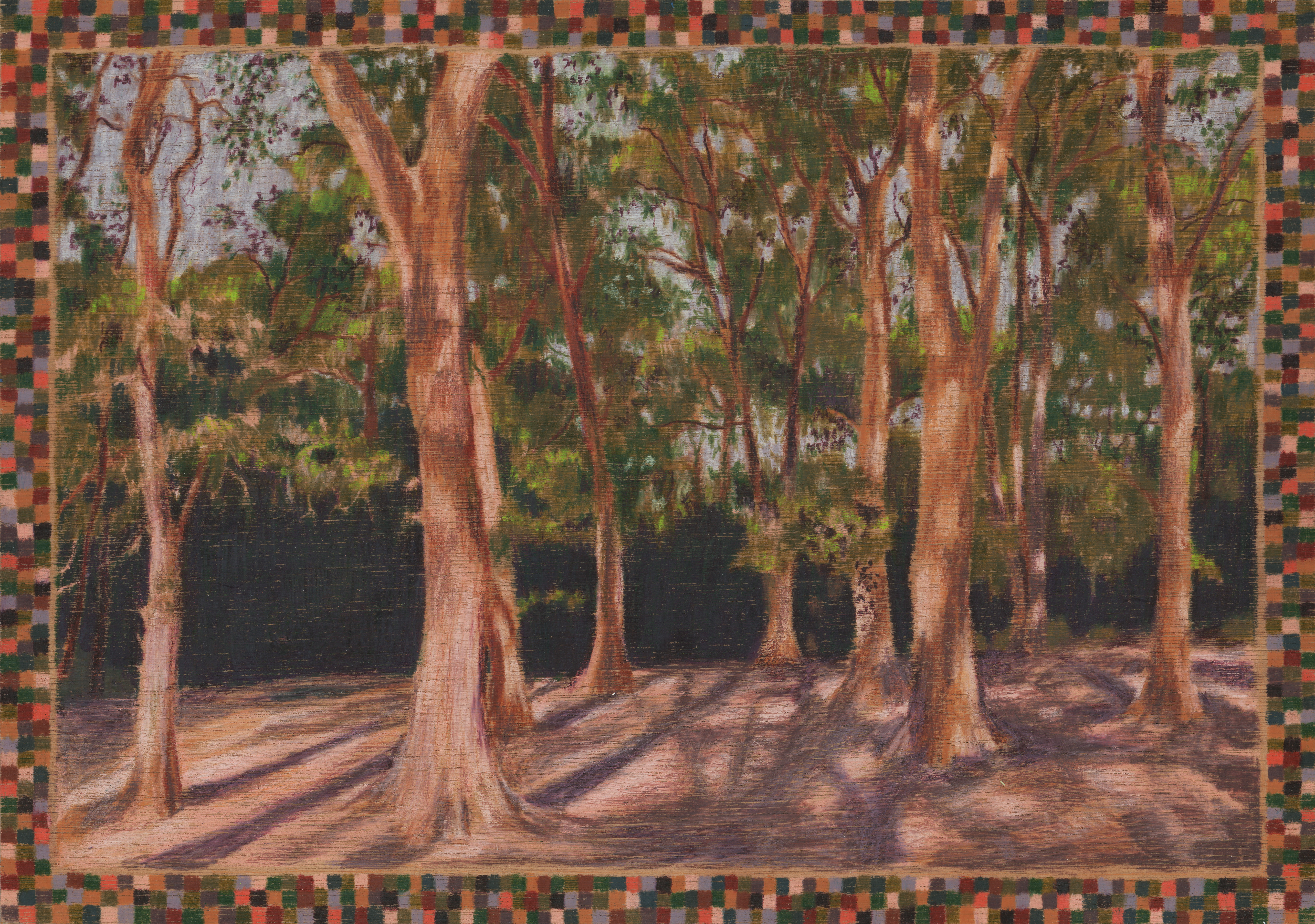 My practice consists of drawing vibrant, intricate scenes that turn depictions of nature into otherworldly landscapes. I am most interested in pattern and colour. Of course the idea of what is beautiful is regularly thought to be superficial, but I think there is something very powerful and intuitive about the connection we have to things that are beautiful. For me (and most people) this often resides in nature, and so my work has instinctively taken on this theme. I think that there’s something incredible about the fact that an arrangement of colours and shapes can trigger a sense of pleasure within me. This feeling of content is what I search for when making work. The intangible algorithm of what aesthetically makes sense and doesn’t make sense fascinates me. It’s personal and subjective yet also seems to be universal. There are certain colours and patterns and marks that I consistently return to, and I frequently wonder what it is about these things that have made them stick. I am a habitual artist and part of my practice is to remind myself to break out of the patterns that I fall into, to experiment and work through things that don’t make sense until they do. It’s a battle with muscle memory. I like to refer to a place that I have been to and transform the memory into a place of its own. With drawing you can exaggerate or minimise information capturing the essence of a place, which I find it to be quite a poetic process.