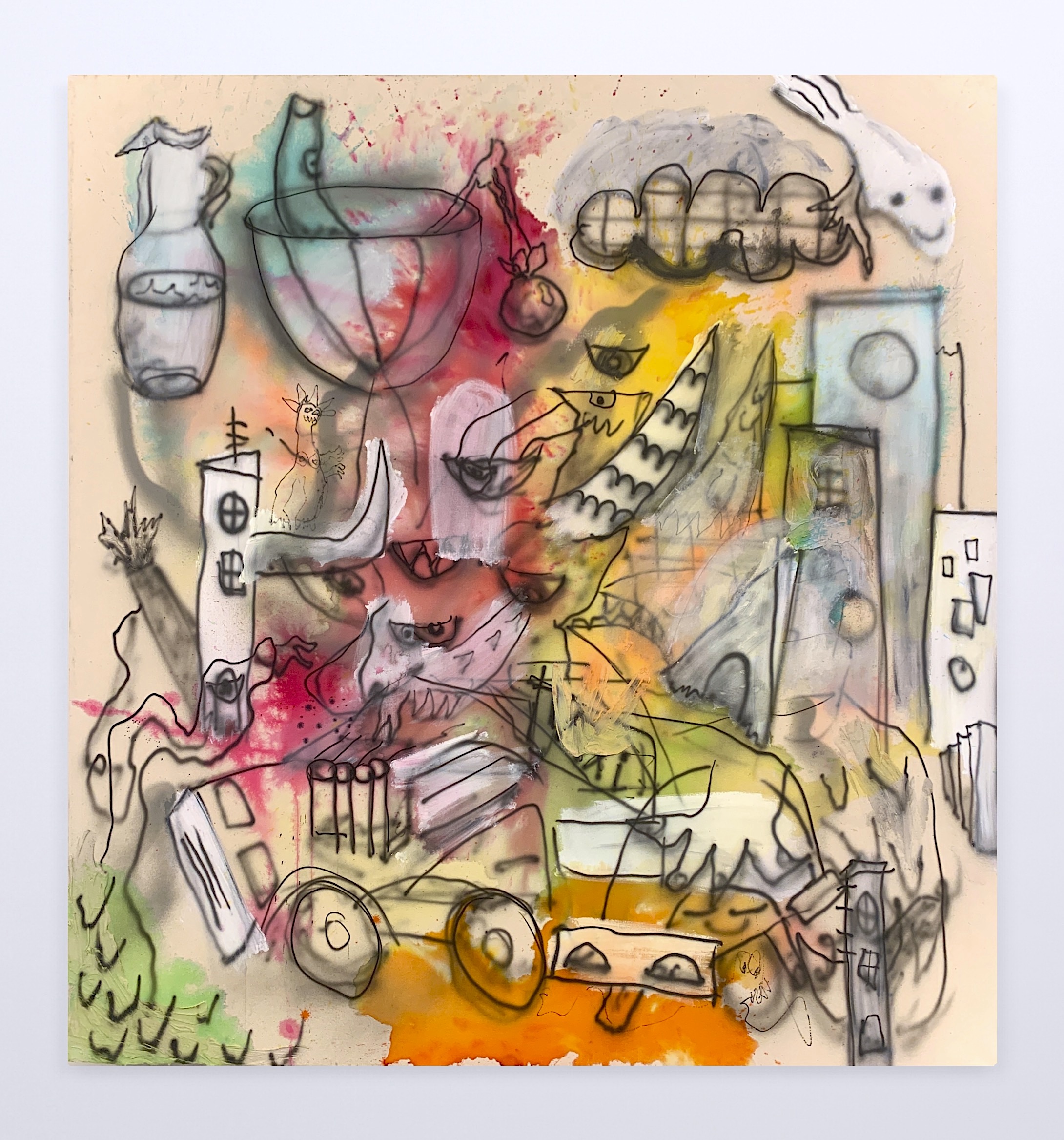 Frantic energy predicated on a desire for energy exchange between painter and viewer, as well as liberal use of color and crowded space, are signatures of Orlando Marosini’s mixed media works. Inspired by modern artists such as Jean-Michal Basquiat, George Condo, and Basquiat’s own inspiration, Willem de Kooning, symbolism and abstraction are ever present components of Marosini’s art. The almost tangibly familiar aspects of the unknown are of particular interest to the artist, whose excitement at the possibility of illustrating these parallels directly impacts his inclination to use characters as vehicles for emotions.