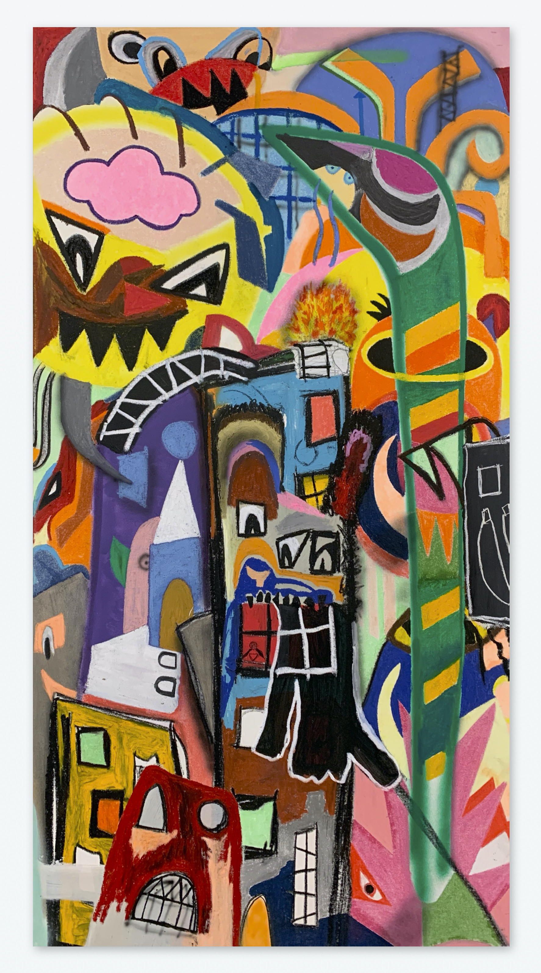 Frantic energy predicated on a desire for energy exchange between painter and viewer, as well as liberal use of color and crowded space, are signatures of Orlando Marosini’s mixed media works. Inspired by modern artists such as Jean-Michal Basquiat, George Condo, and Basquiat’s own inspiration, Willem de Kooning, symbolism and abstraction are ever present components of Marosini’s art. The almost tangibly familiar aspects of the unknown are of particular interest to the artist, whose excitement at the possibility of illustrating these parallels directly impacts his inclination to use characters as vehicles for emotions.