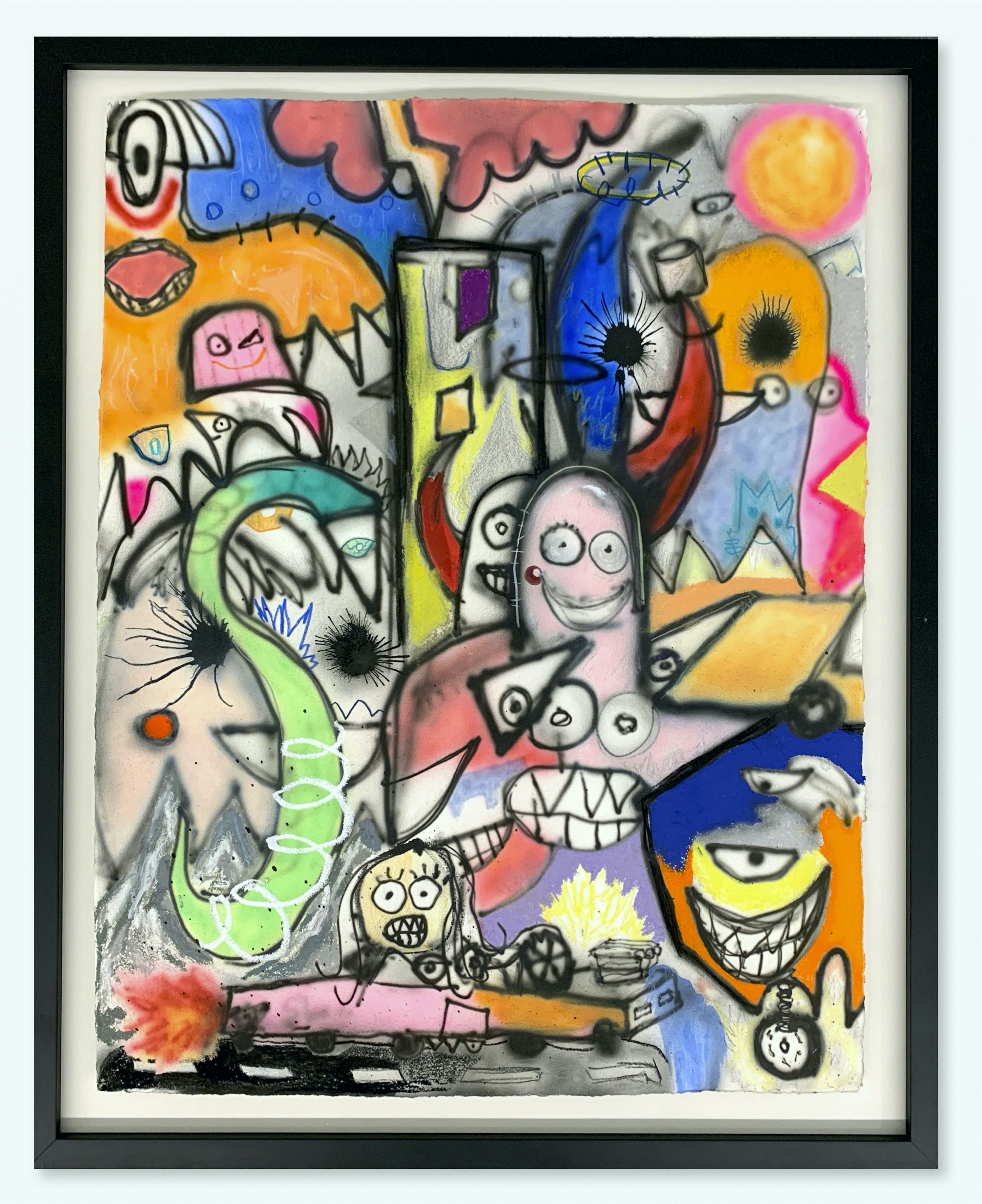Frantic energy predicated on a desire for energy exchange between painter and viewer, as well as liberal use of color and crowded space, are signatures of Orlando Marosini’s mixed media works. Inspired by modern artists such as Jean-Michal Basquiat, George Condo, and Basquiat’s own inspiration, Willem de Kooning, symbolism and abstraction are ever present components of Marosini’s art. The almost tangibly familiar aspects of the unknown are of particular interest to the artist, whose excitement at the possibility of illustrating these parallels directly impacts his inclination to use characters as vehicles for emotions.