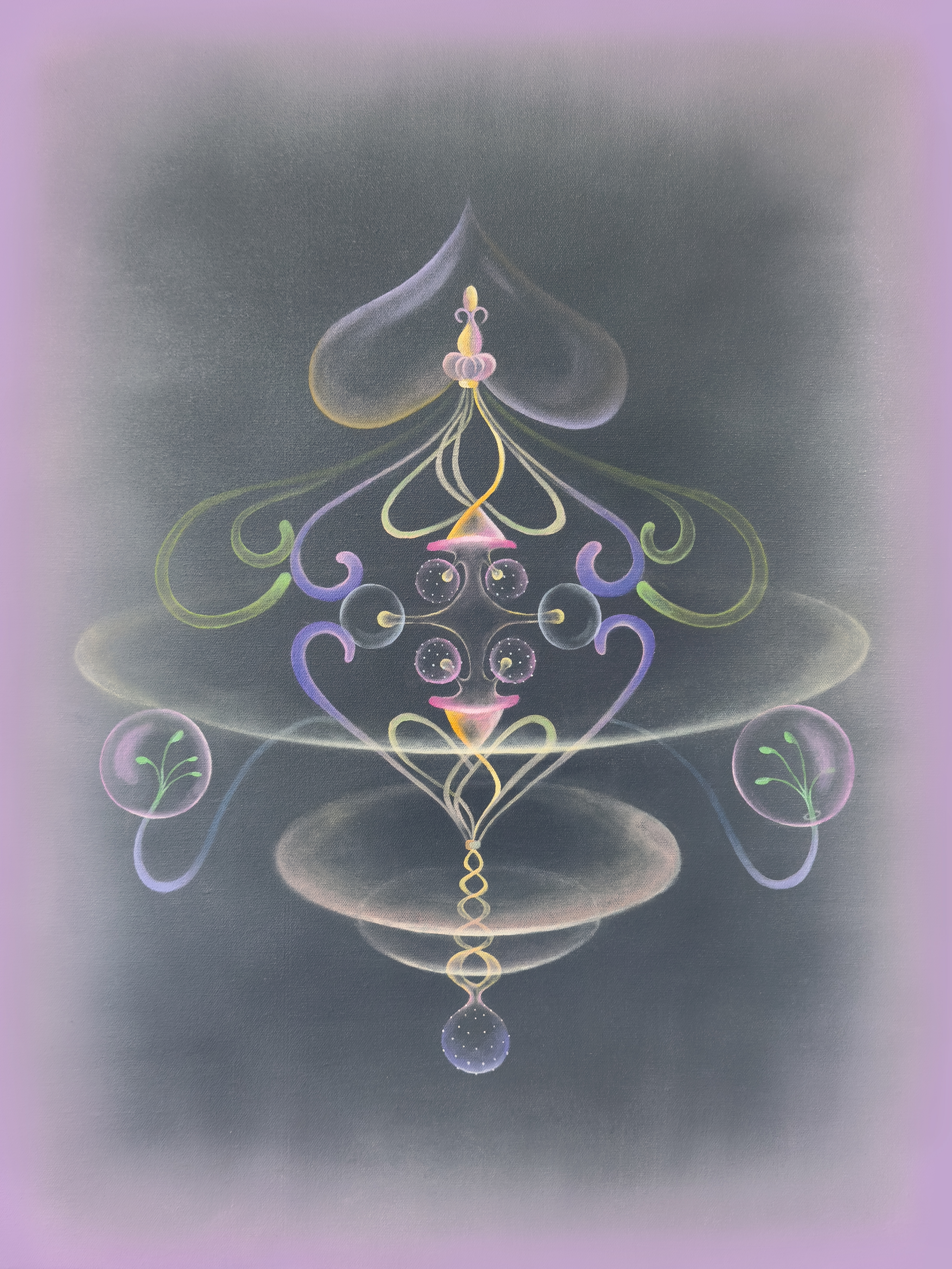 创作这幅作品的灵感来源于我耳朵发炎的时候,当时我一边不停地画画和素描,一边第三次重看 Netflix 上的《黑暗》。这让我开始思考死亡,以及时间是一种幻觉,只存在于我们存在的维度。 我画这幅画是为了表达一个守护者的想法,在我活在世上的时刻指引我。这个守护者超越了时间和空间,用一种我只有在流动的时刻才能理解的超凡脱俗的语言与我交流。