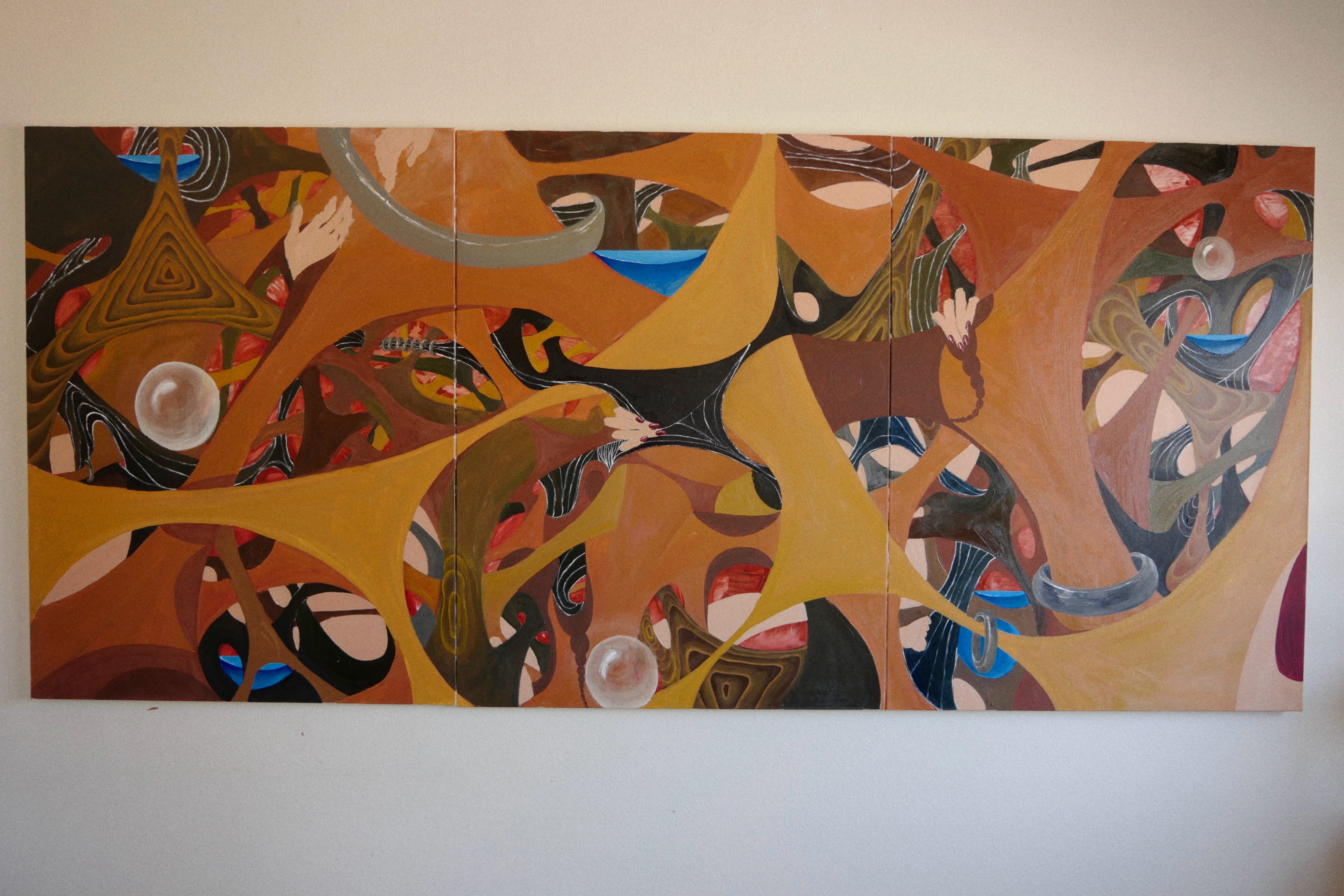 Yellow and brown establish an earthy foundation for the painting, while elements such as water, mist, trees, and metal represent my vision of energy given form. The accents of blue and white symbolize my pursuit of moments of transcendence and clarity.