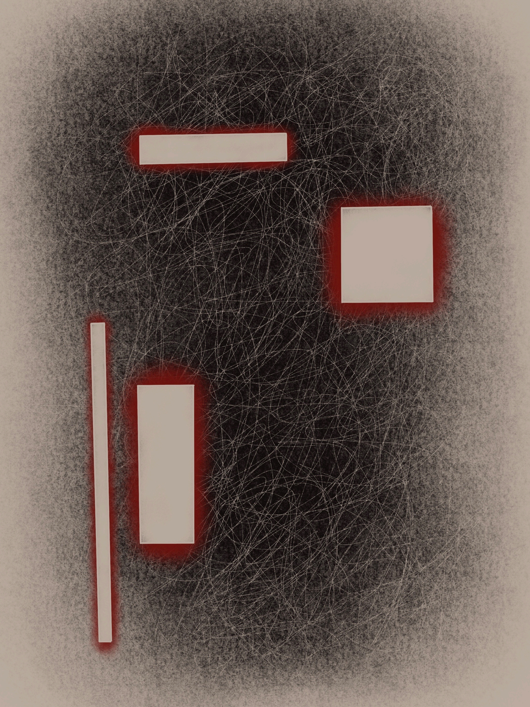 This artwork evokes a cosmic meditation on the intersection of mysticism, energy, and the infinite void of the universe. The intricate web of lines resembles the fabric of space-time, where each thread signifies a ripple of energy, a subtle vibration that binds the cosmos together. The bold red geometric shapes punctuate this dark expanse, acting as windows, portals, or thresholds into the unknown—perhaps gateways to higher dimensions or metaphors for human perception striving to grasp the ineffable.