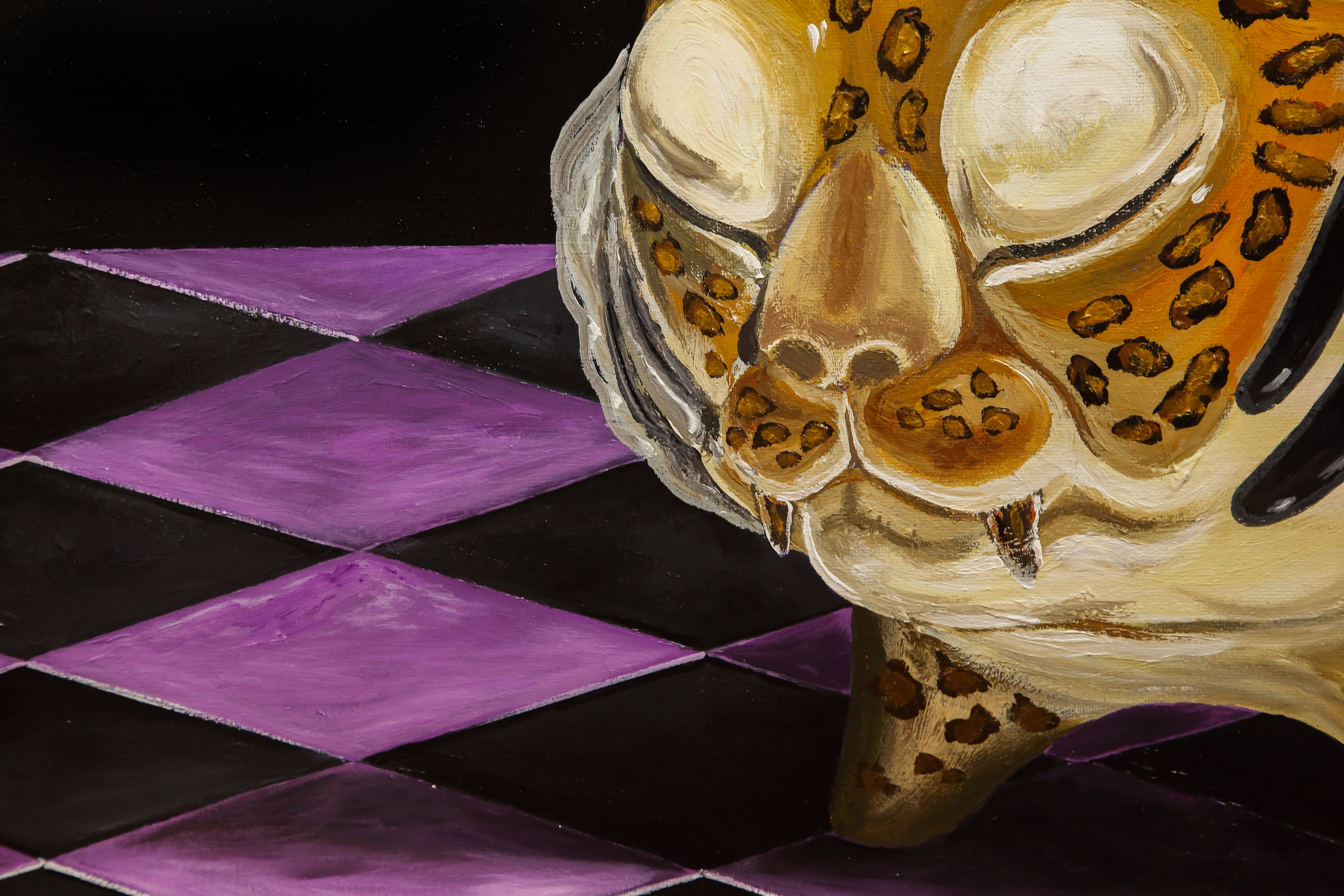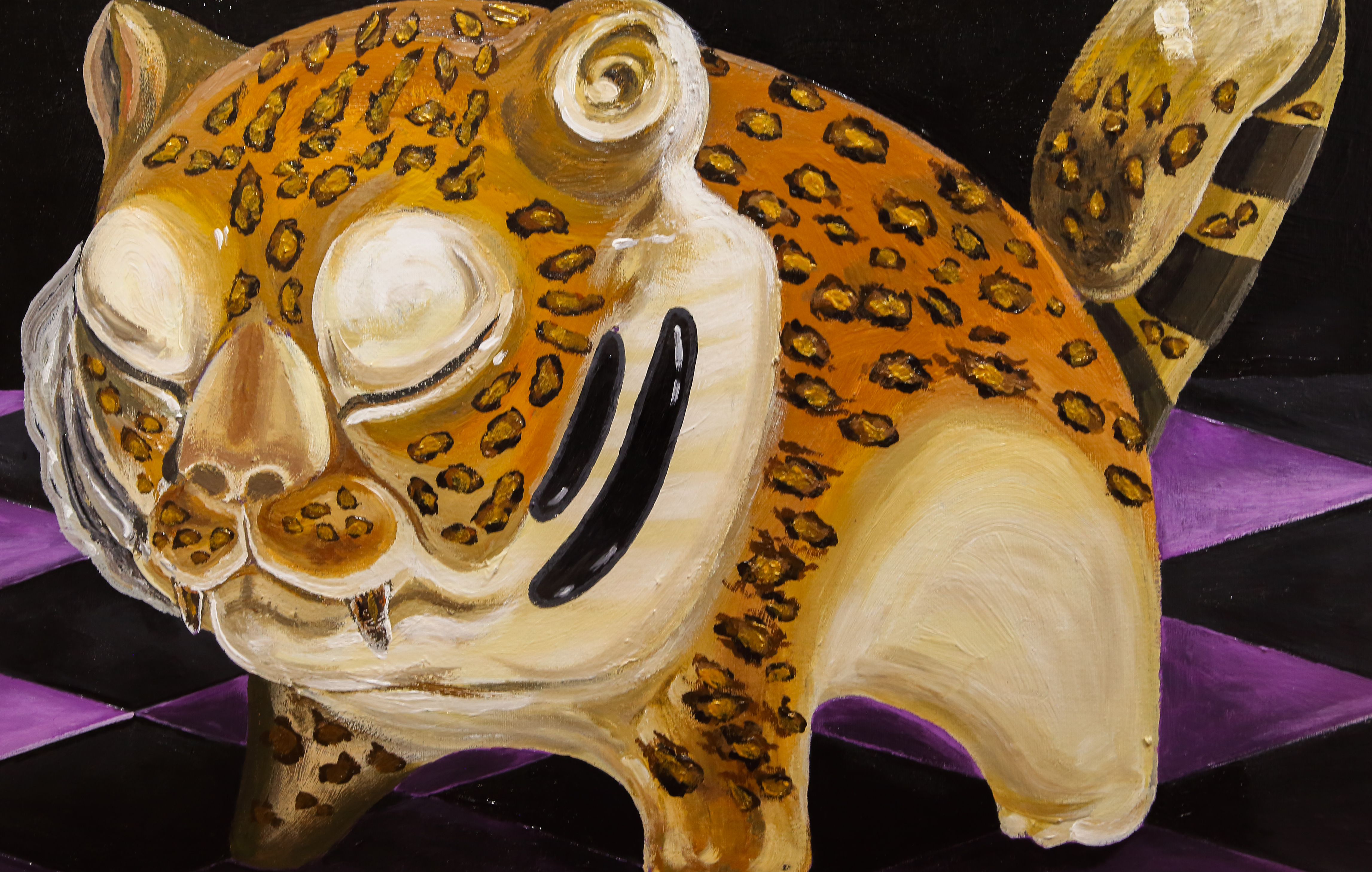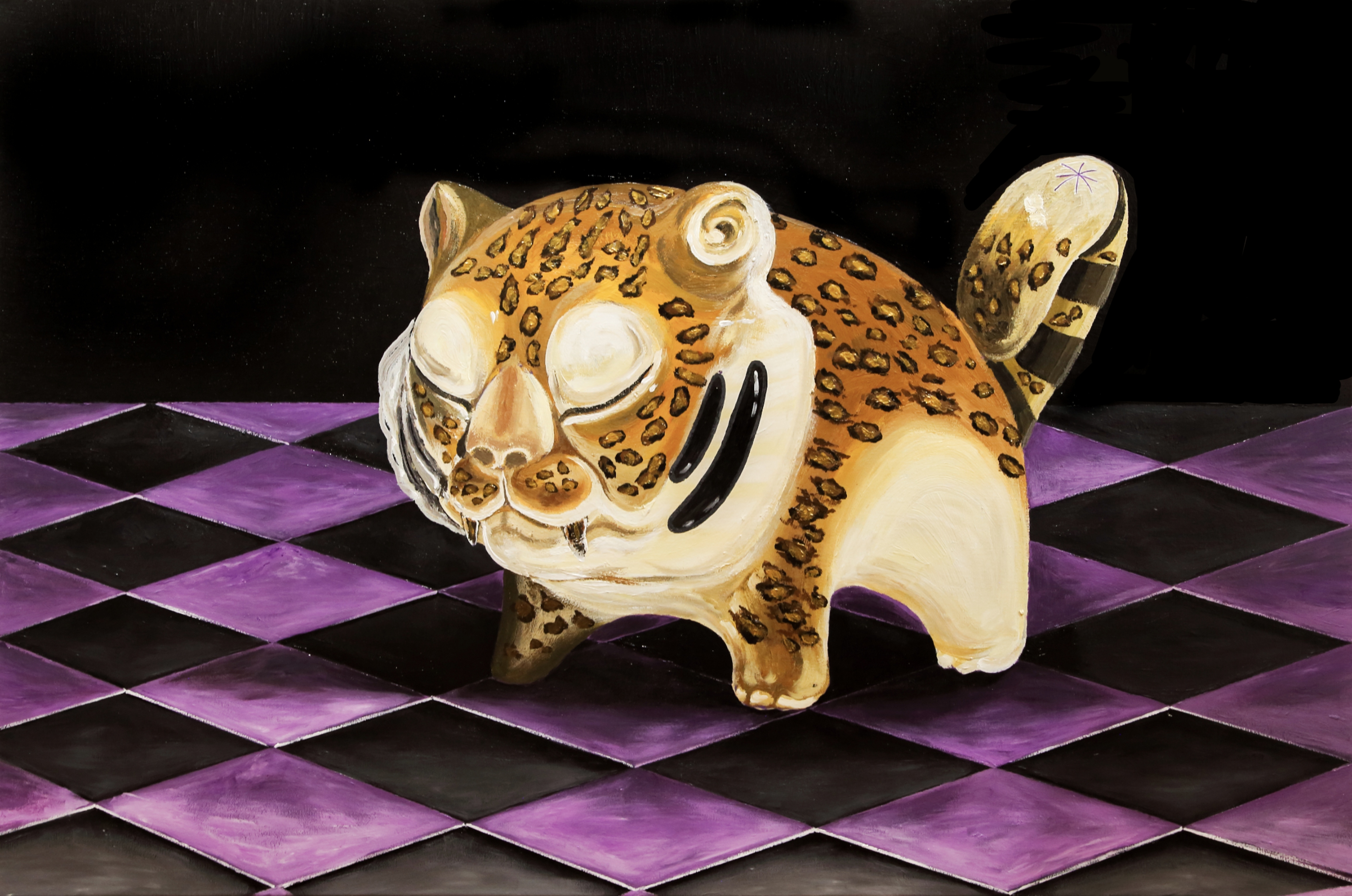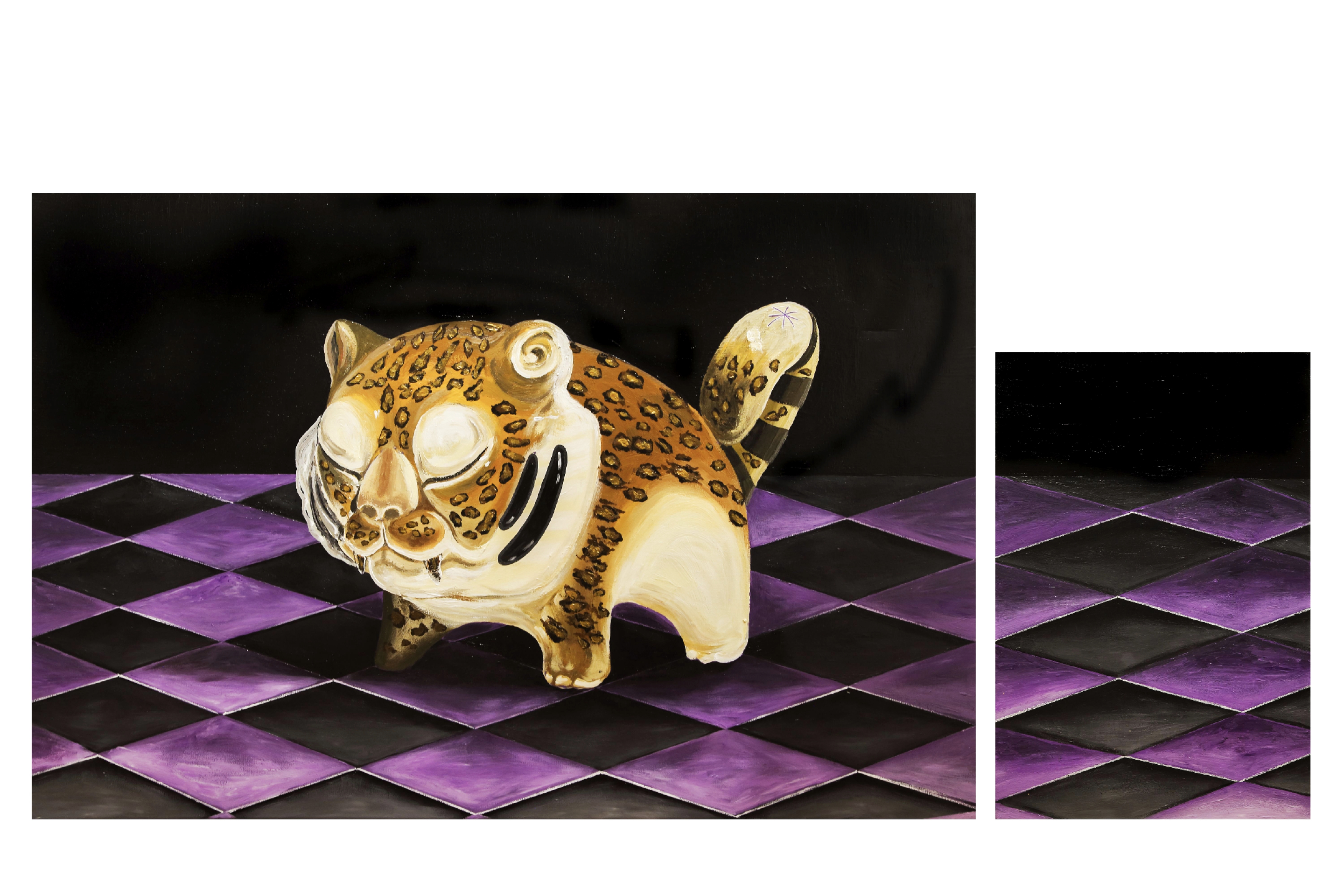 对我而言,艺术不必承受改变世界的重任,以绘画的方式离开现实,表达自己的看法。这个小小剑齿虎是我的一种表达。对着画布做梦,寻找一个模糊不清的梦。在这个梦境中享受着某种清醒,背景用黑覆盖,构建一种可望不可及的视觉体验。一个在现实中无法实现却显得合理的视觉空间。