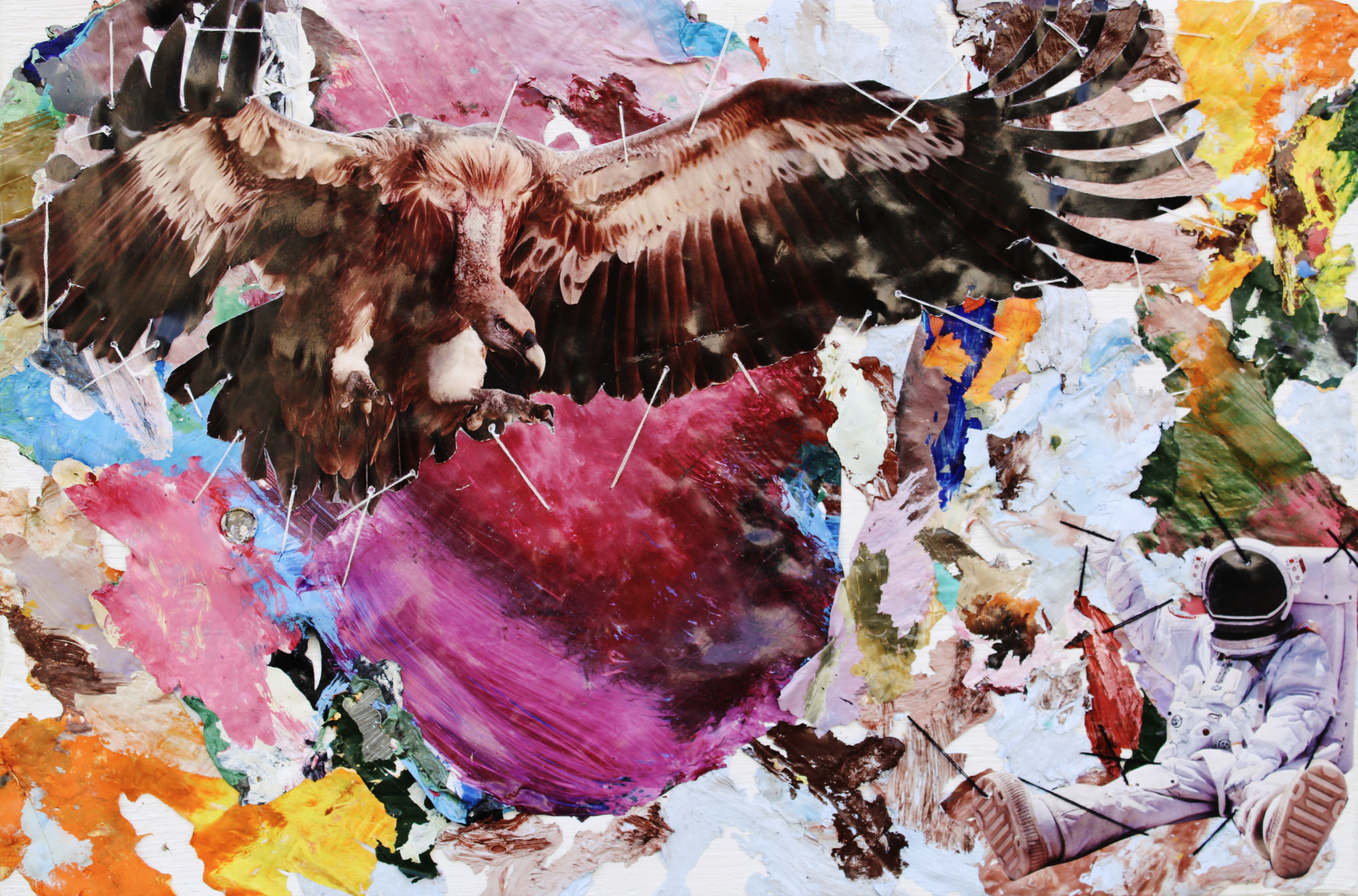 这张画是一张非绘画的绘画作品,主要材料构成是调色盘上不断凝固再覆盖再凝固所结成的丙烯涂层,一个个碎片组成整体色调,而波普拼贴的加入,使得它们是涂层也是图层,无论是否具象化。