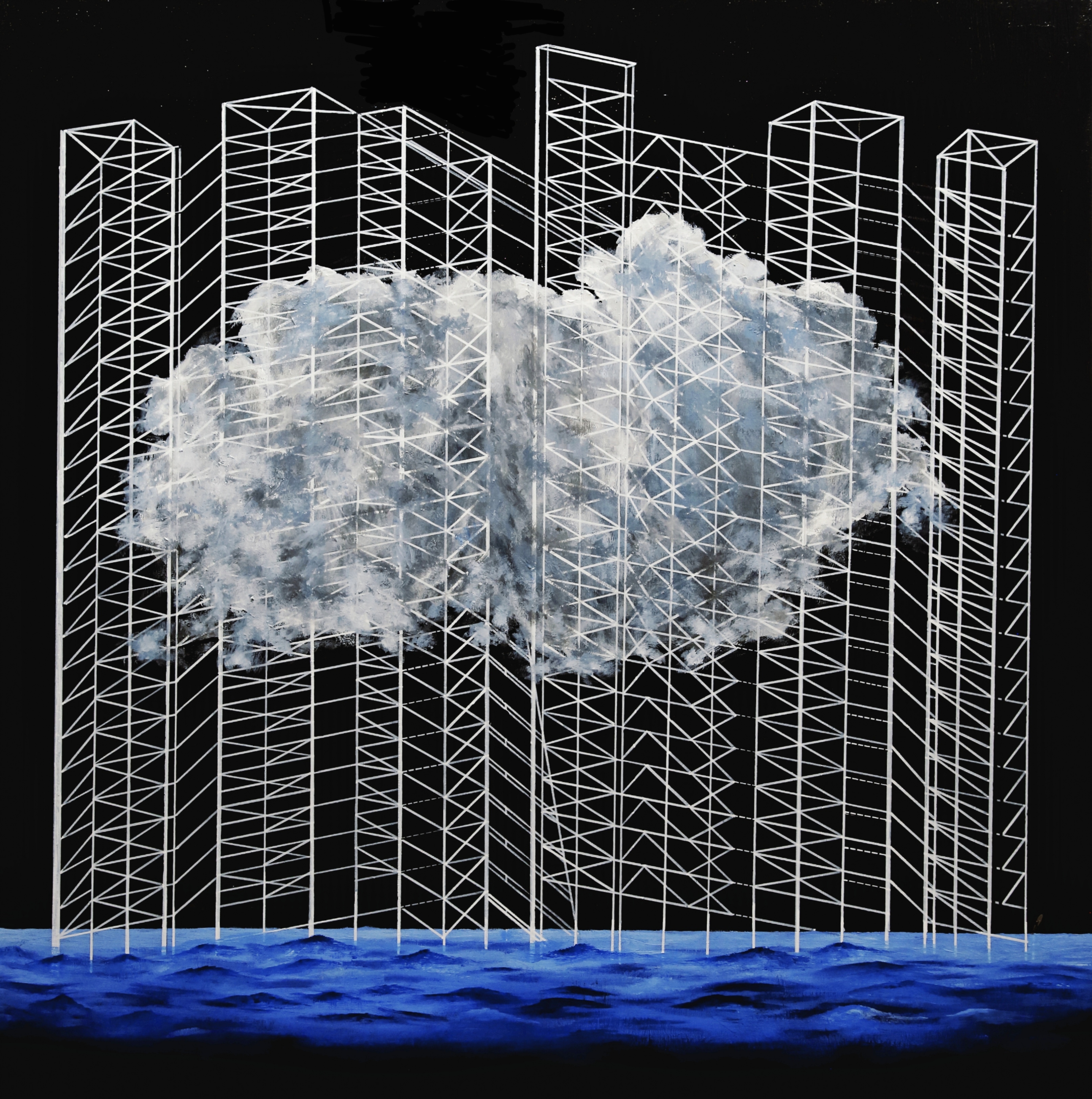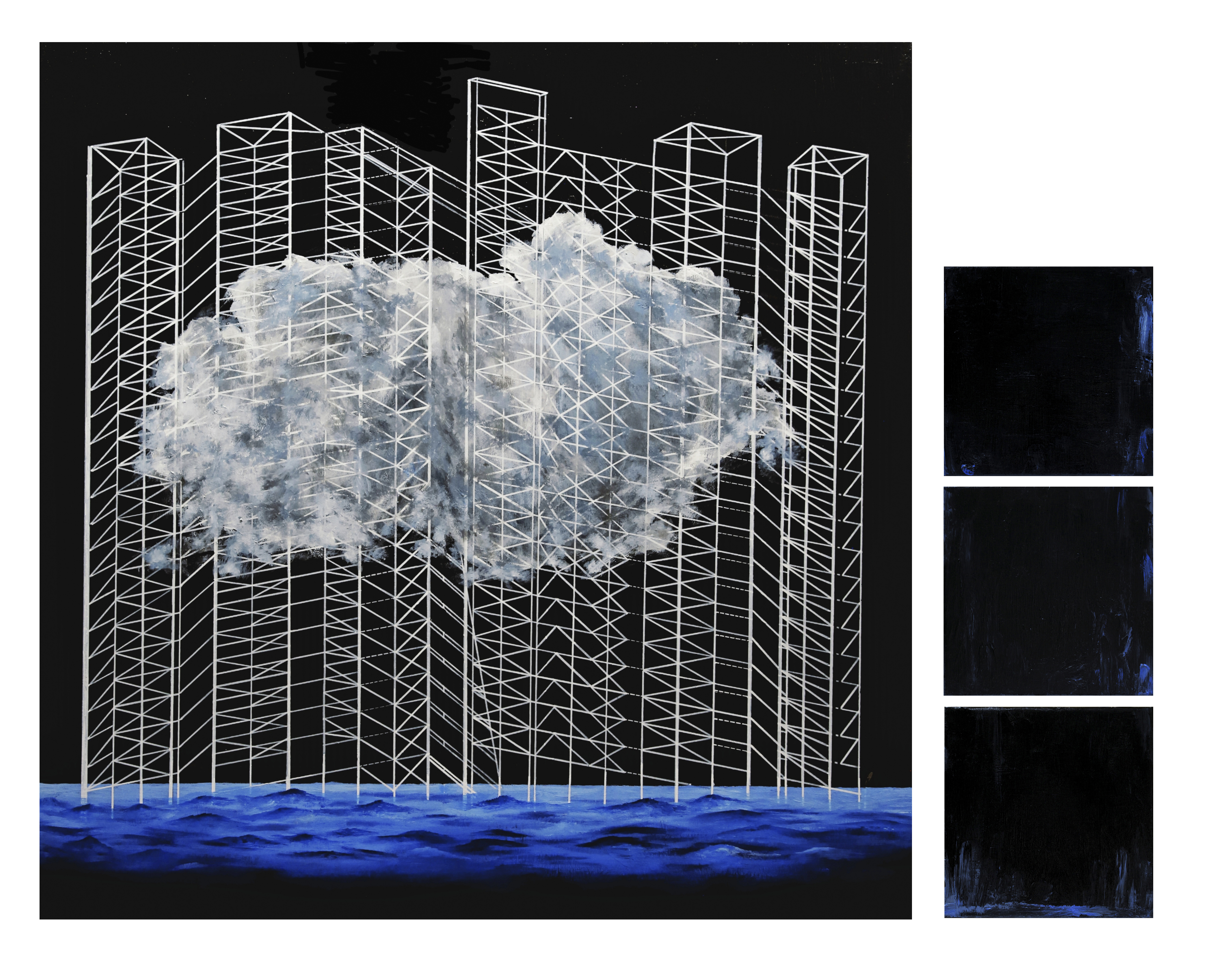 这张作品试图探索作为社会和自然之间媒介的绘画行为,这画面中形似云朵的物象被转化为人工景观和人类行为。自然的景物堆积、抗衡、协调、相互咬合、互为基底,我想顺势探讨当代文化语境中人与自然的冲突,通过视觉语言的绘画感受人工景观与自然的距离,以及人工景观与现实生活的断裂。