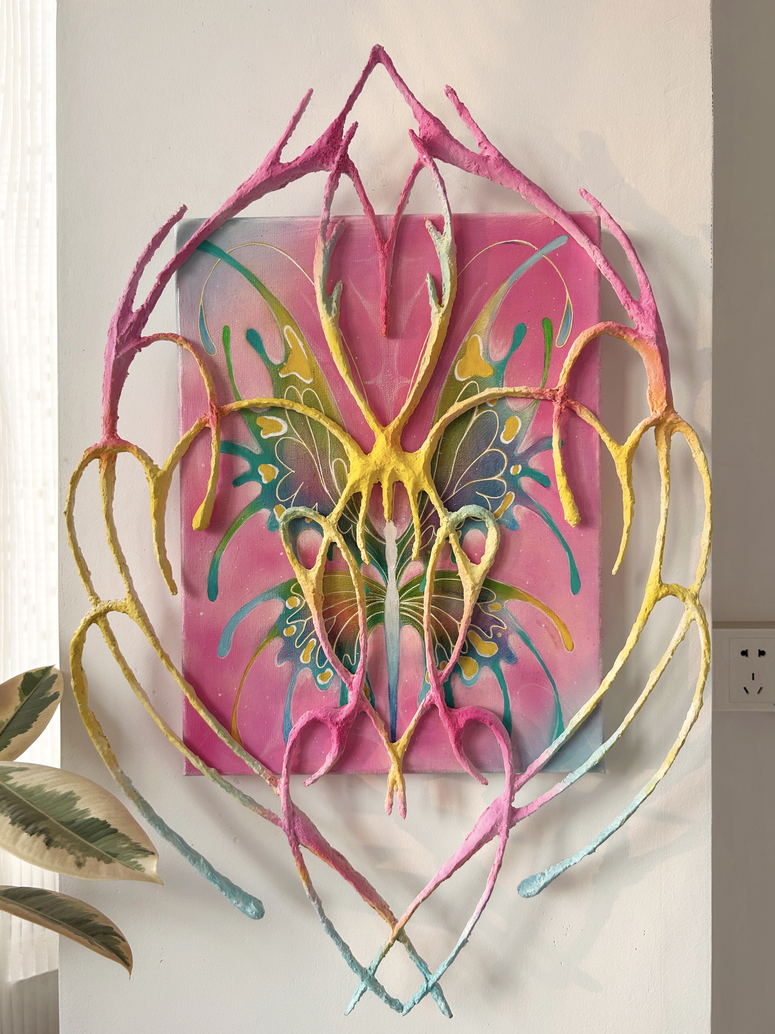 蝴蝶飞出画框,生命力随之觉醒 线条与色彩交织,绽放灵性与能量 打破边界,释放创造力 与生命共舞,自由生长