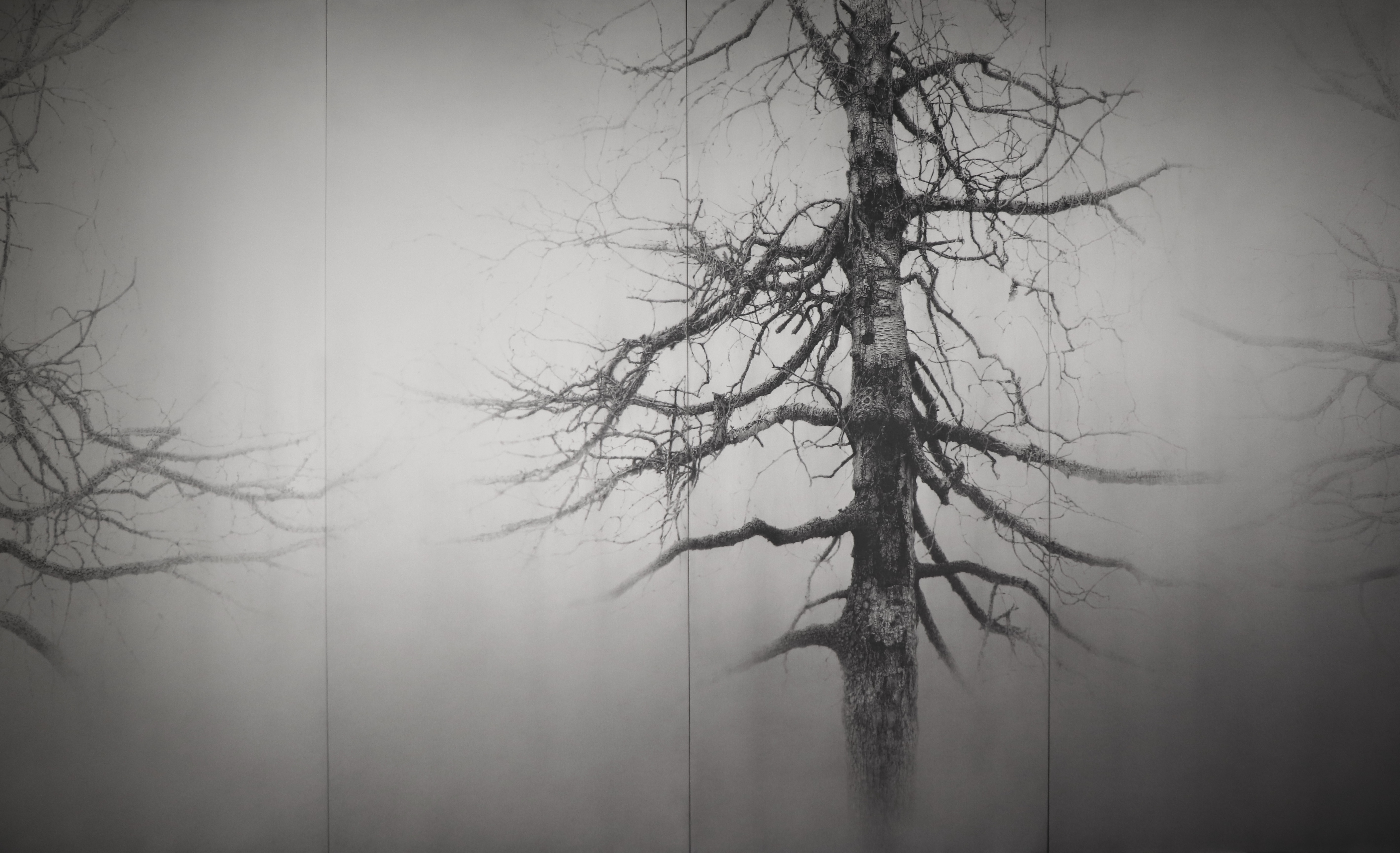 The Japanese artist Yuichiro Sato works in Kuhankoski/Laukaa, Finland, where he creates stunningly accurate drawings of the Finnish nature. The pencil and charcoal renderings display his fascination towards the Finnish nature. Sato takes walks in his nearby forests and photographs them, which act as the basis for his immersive and tranquil large-scale works. For Sato, the nature is cosmic in its countless parts and an endless inspiration for him.