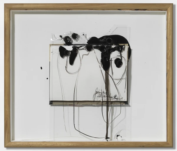 Alcaraz incorporates a great number of different materials to his minimalistic works including metal, wood, paper, books, ceramics, as well as transparent objects, like plexiglass (which he sometimes modifies by bending or melting holes in it). Traditional painting mediums and colors are not used to a great extent - instead the artist utilizes the interplay between shadow and light with different materials and surfaces. The distinct black lines of ink and metal wire create circular and angular forms in the midst of three-dimensional layers.