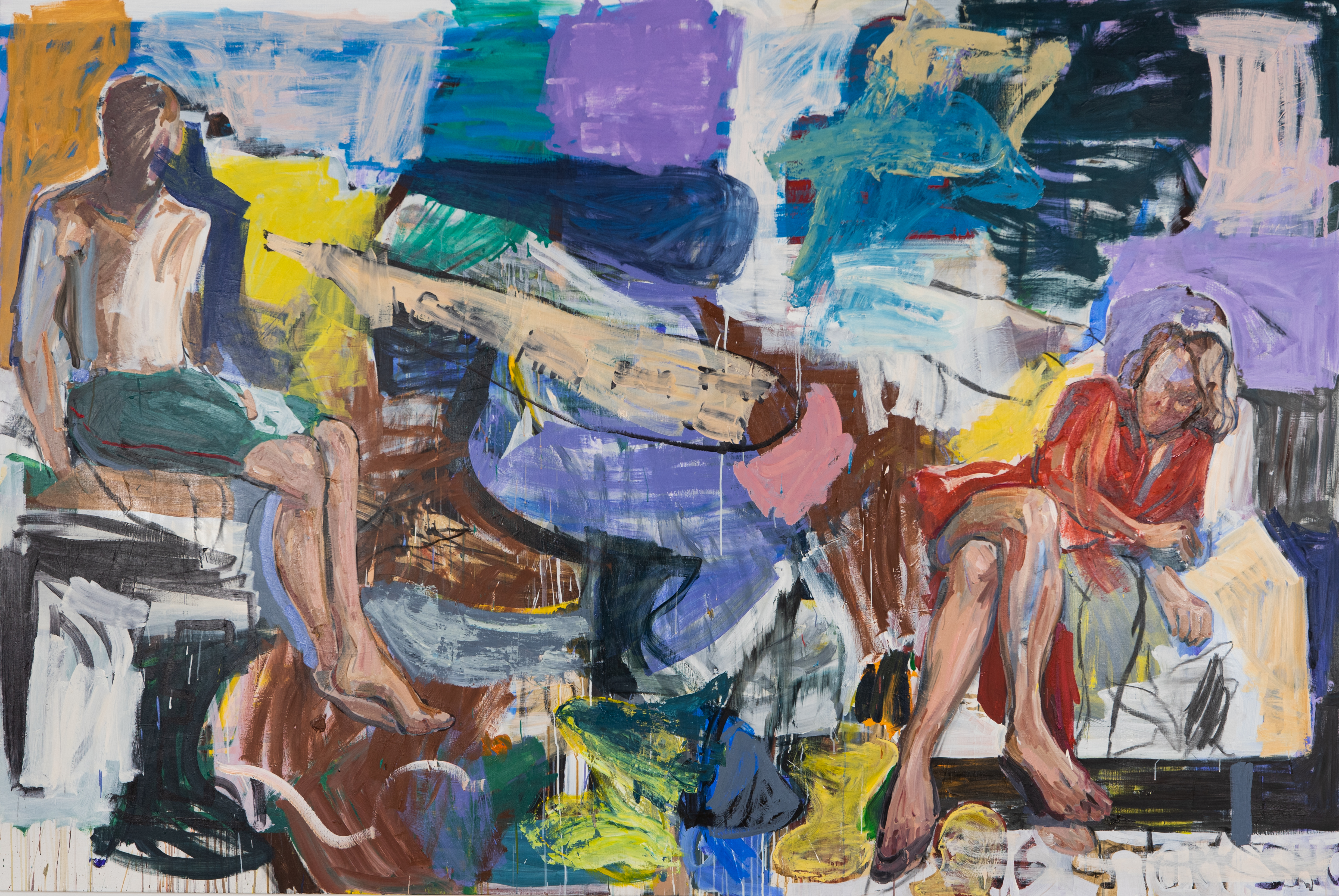 Harri Puro’s paintings are constructed on top of drawn motifs on canvas. The drawings, based on the people in his immediate circle, do not guide the painting beyond its start, rather, these works are alive and change constantly as the process advances. Occasionally a work that began by being horizontal can turn upright, while in the meantime numerous new motifs have emerged on top of the original one. The initial charcoal drawings can be glimpsed between the layers of paint, but the original idea is rarely still present in the finished work, since the figures and shapes adapt and merge into new frameworks. In Puro’s paintings an intuitive way of painting and abandonment of plans leave room for surprizes and for interesting strata.