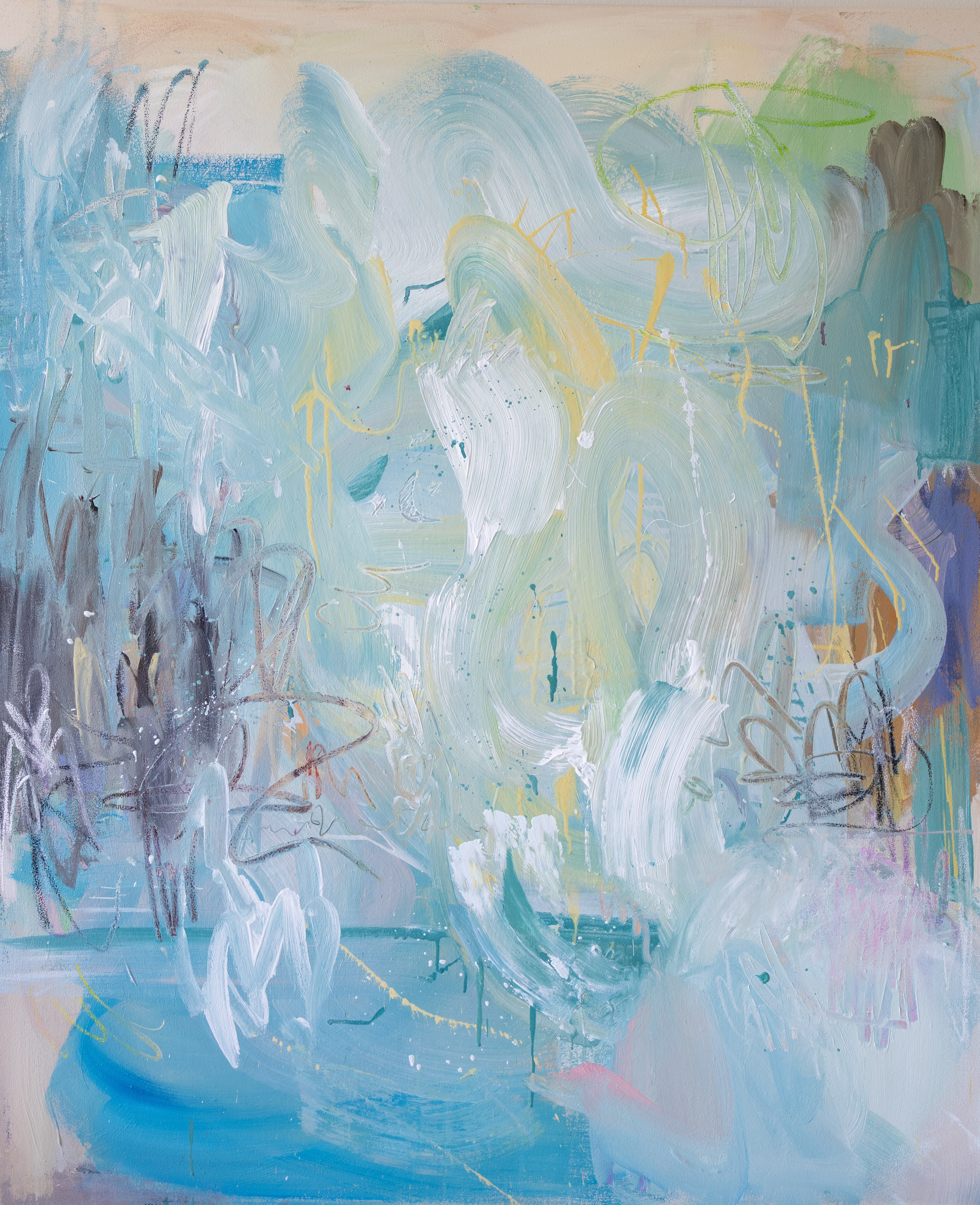 Original painting on raw deep edge canvas made with acrylic paint and oil pastels. Inspired by the turquoise waters of an island in Spain that Lina visited. Ships rolled.