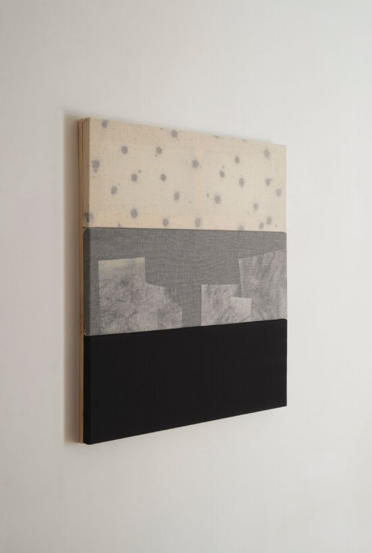 纱布、薄纱、塔里坦布、颜料、线、棉绳,装裱于多块木制画框上