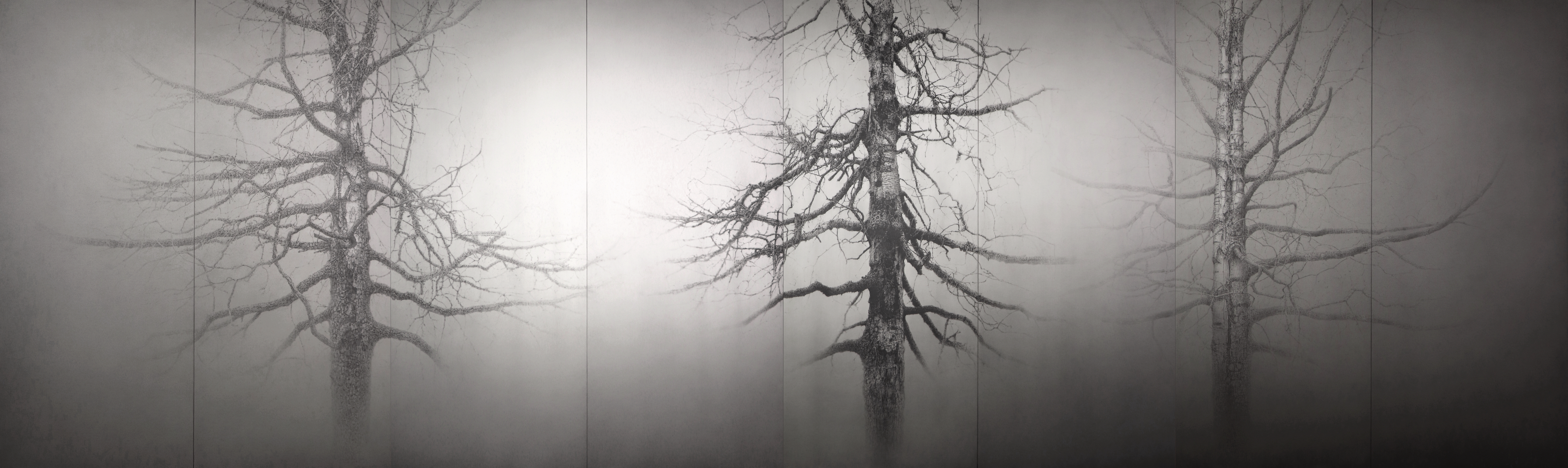 The Japanese traditional art, called “Japanese Painting”, has influenced Sato significantly and is the basis for his technique. What is transferred onto the paper, is not always the visible world, but also the invisible; the smell, sense of touch and sound of the forest. When gazing at the works, the viewer has a vivid sense of the silent surroundings and the life that the trees and the ecosystems of the depicted forests contain.