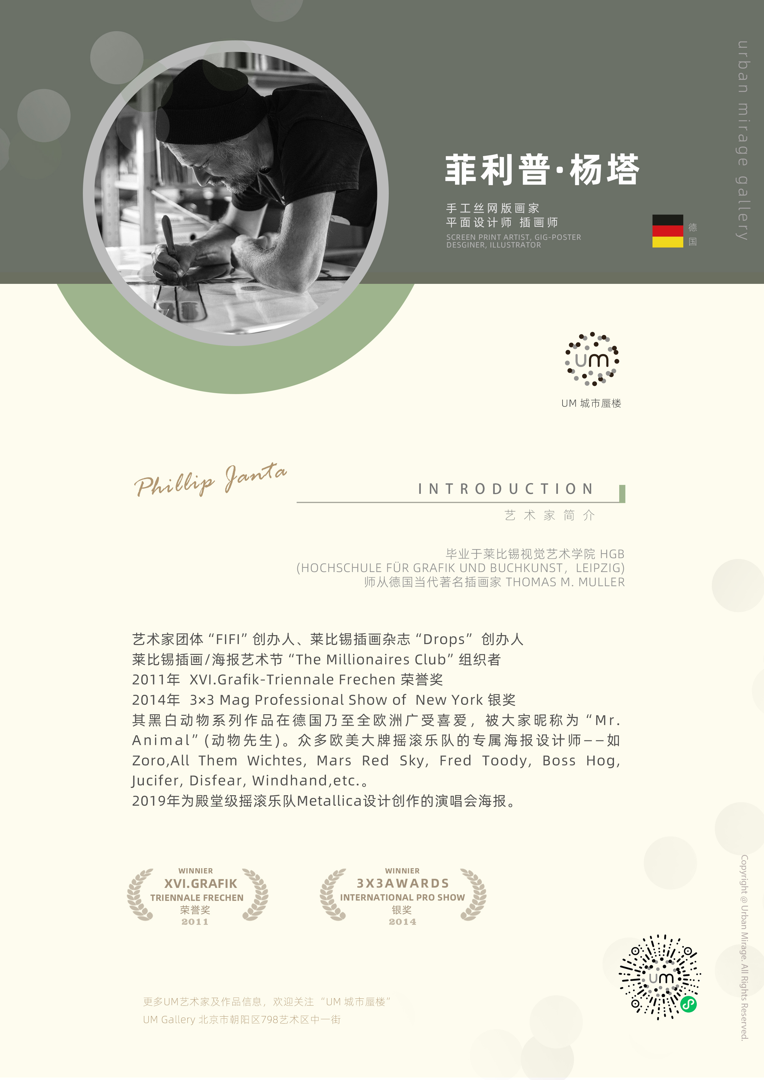 菲利普是艺术家团体“FIF” 创办人;莱比锡插画杂志"Drops"创办人;莱比锡插画/海报艺术节“The Millionaires Club” 组织者。2011年 xv1.Grafik-Triennale Frechen 荣誉奖。2014年 3×3 Mag Professional Show of New York 银奖。