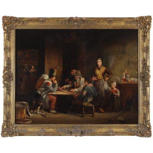 A fine oil on panel painting by Frederick Goodall (1822-1904) of a group of people playing chequers inside a tavern. A beautifully detailed work of art which captures the real mood of the scene.