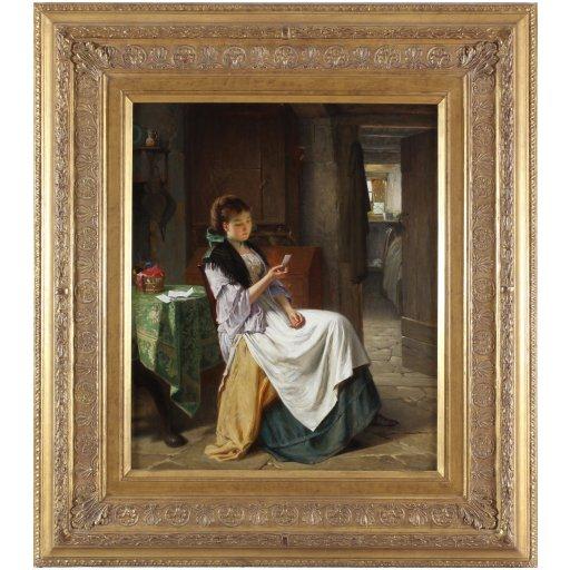 A well painted oil on canvas painting by Haynes King (1831-1904) entitled “The Love Letter” depicting a young woman seated in an interior reading a letter.